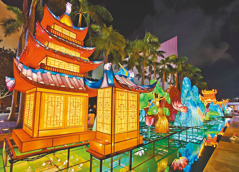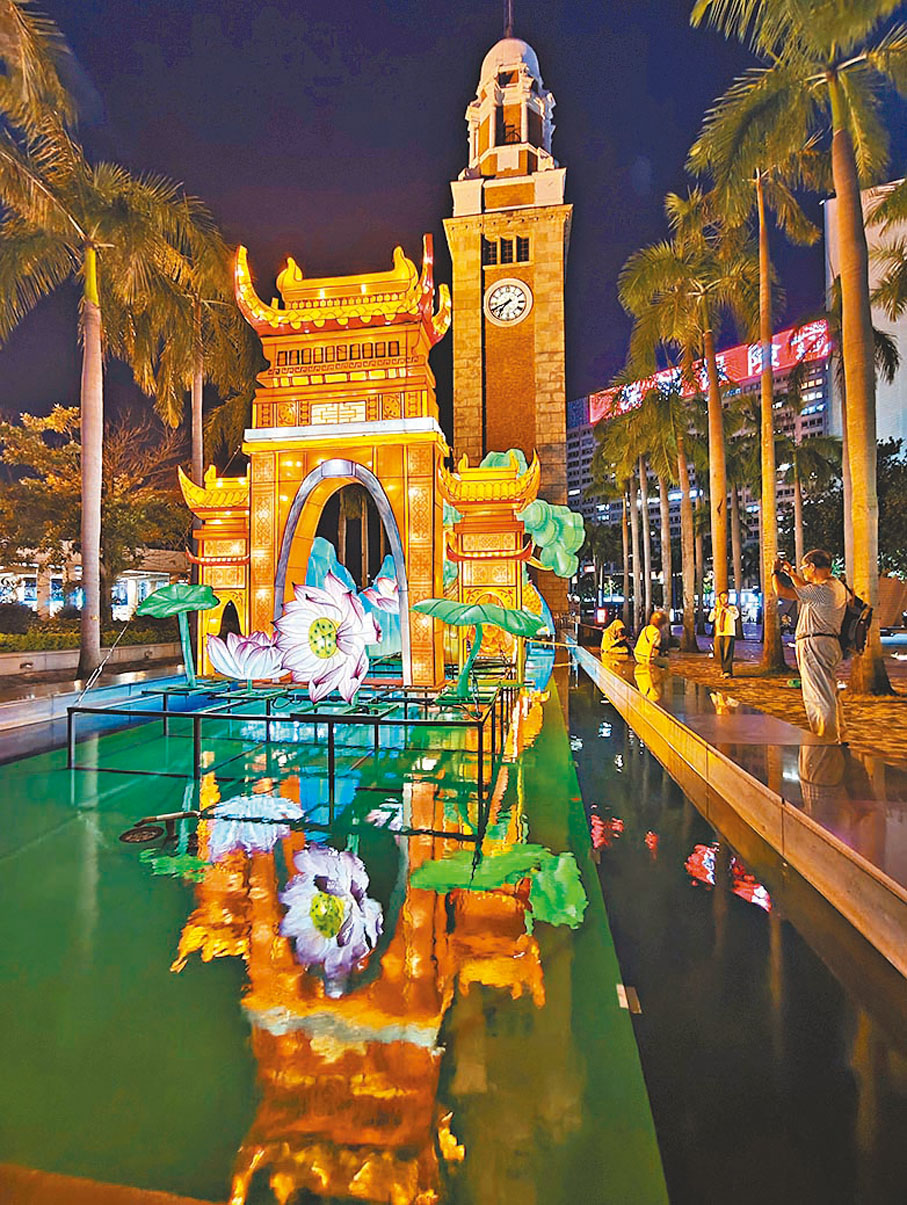 每逢中秋節,康文署都會在多區舉辦中秋綵燈會,展出主題節慶綵燈和光影裝置外,更設有傳統工藝及表演等,是港人的中秋盛事。今年適逢中華人民共和國成立75周年,有些燈會特地延長時間至10月6日,如在香港文化中心露天廣場的水池展出的綵燈《月上龍宮》,由本地多媒體藝術家蘇暐朝設計,結合四川傳統花燈紮作工藝打造,以龍為主體設計概念,展示中國人熱愛中秋傳統,並擁有遠大理想和抱負,追逐天上的明月,實現載人登月的願景。●採、攝︰雨文