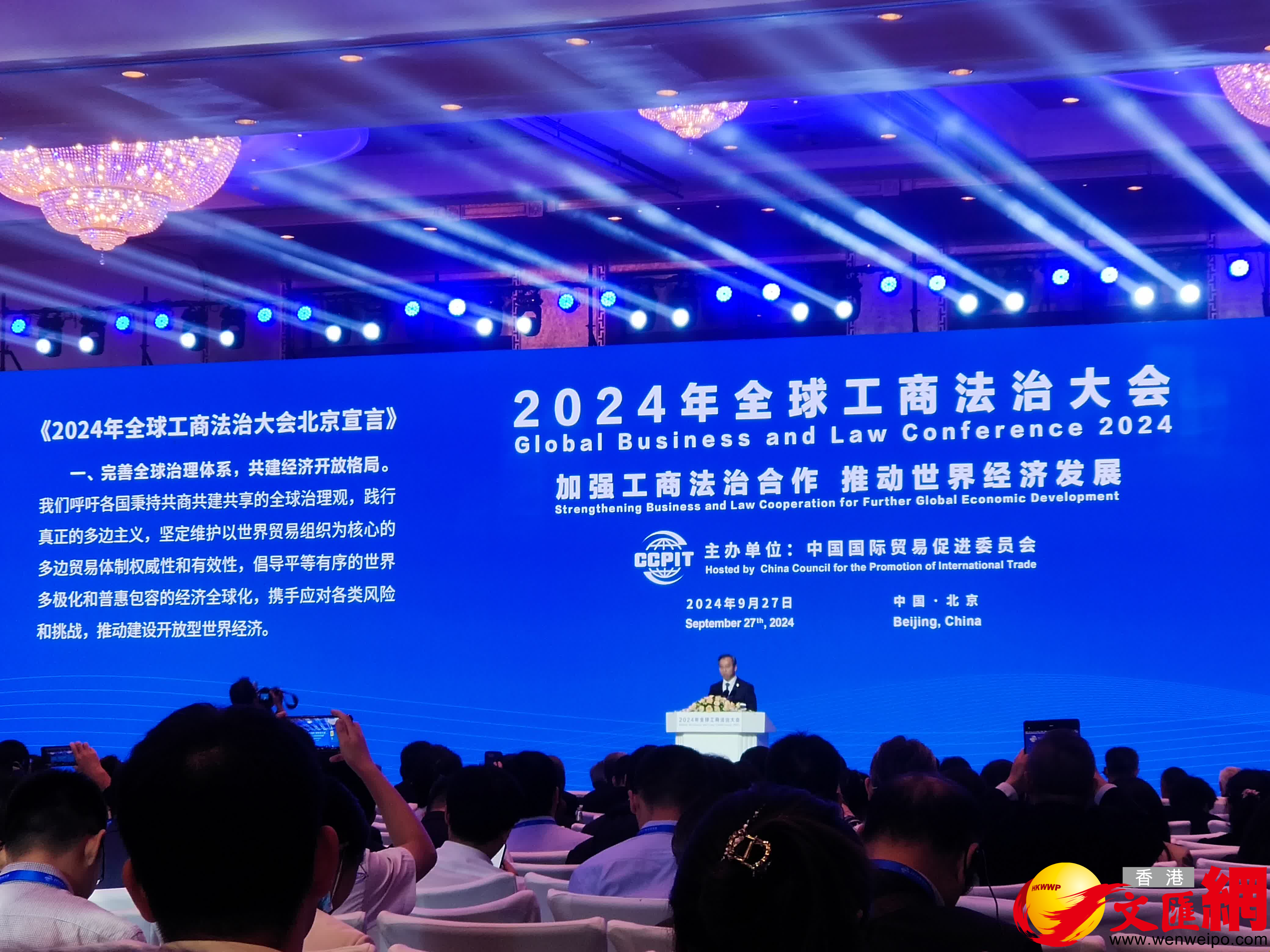 開幕式上,中國貿促會會長任鴻斌代表與會工商界、法律界發布《2024年全球工商法治大會北京宣言》,包括完善全球治理體系,共建經濟開放格局;優化全球營商環境,促進世界共同發展;強化法治保障作用,激發產業創新動能;深化全球法商交流,拓展國際合作空間;凝聚全球各方共識,共創世界美好未來等5項內容,呼籲推動經濟開放合作,促進全球共同發展與繁榮。