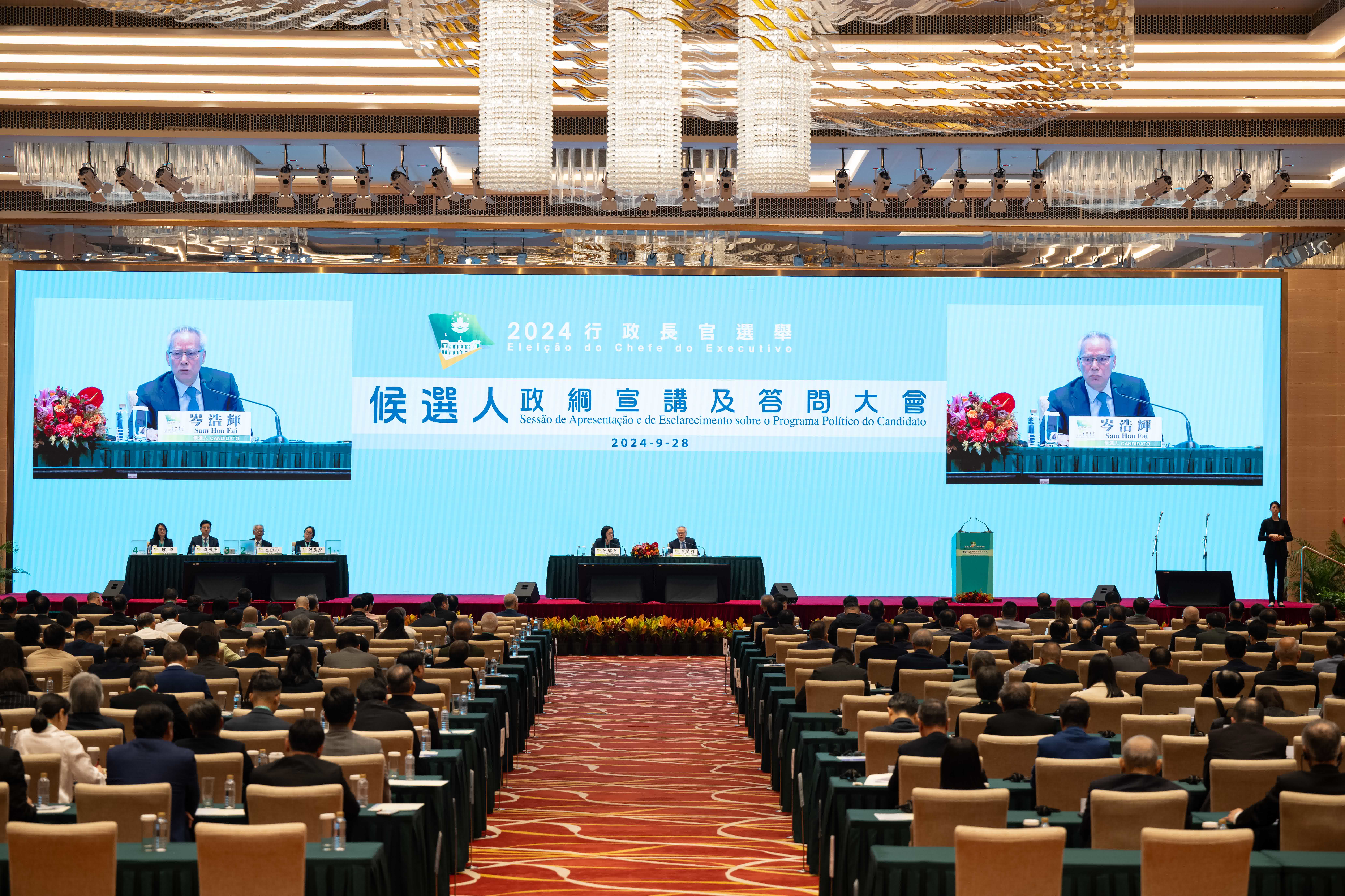 澳門特別行政區第六任行政長官選舉候選人政綱宣講及答問大會28日舉行。第六任行政長官候選人岑浩輝宣講題為《奮發同行,持正革新》的參選政綱,並回答部分行政長官選舉委員會委員的提問。