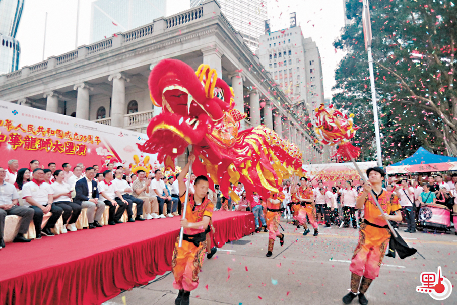 香港文匯報訊(大公文匯全媒體記者 王俊傑)為慶祝新中國成立75周年,香港中西區各界慶典委員會昨日聯同多個社團及商會舉行國慶中華龍獅大匯演,來自香港和廣東等地的龍獅隊,組成8條彩龍和75頭醒獅參加大匯演,共同慶祝中華人民共和國成立75周年。律政司副司長張國鈞致辭時形容,在中國傳統中,龍是吉祥和尊貴的象徵,而獅則是祥瑞靈物,有驅邪降福的能力,相信舞龍舞獅活動亦包含着香港市民對國家未來繁榮穩定、風調雨順的期許。