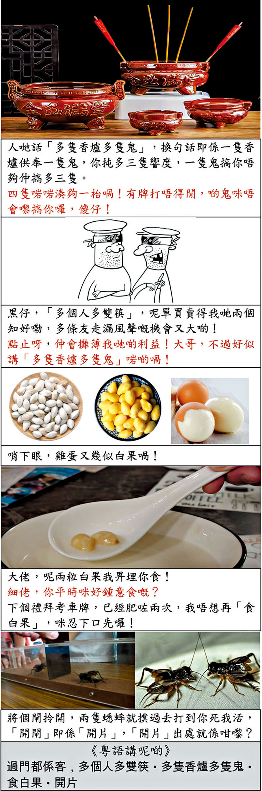 廣東話有句「多隻香爐多隻鬼」,多放一隻香爐就會多招一隻鬼,形容多事就會多煩。香爐用來供奉鬼神,一隻香爐可安放的香燭有限,可供奉的鬼神亦有限。然而,多安放一隻香爐必定會多招惹鬼神,而鬼一般會搞破壞,所以如不多安放就少了些麻煩。「多隻香爐多隻鬼」中的鬼其實係人,只是會搞鬼的人又或損害你利益的人。多了人來,原來的利益自然分薄了。從營商角度,一個龍頭企業在多了競爭對手的情況下,自然會將原有的市場份額攤分。實際上,多了行家進入市場未必是壞事,反而讓相關企業多了商機,從而擴大了得益。