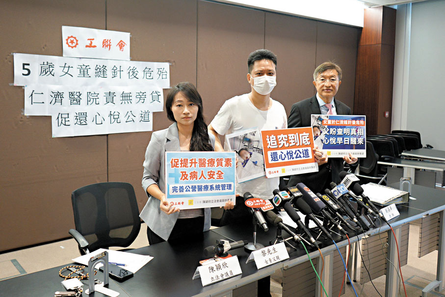 一直協助女童家屬的工聯會立法會議員陳穎欣昨日陪同黎先生召開記者會。黎先生表示,事件破壞其家庭,令全家都非常痛苦。他目擊當日情況是涉事醫護縫針時,將女兒臉部向下、按在枕頭,懷疑因而令她窒息。不過,仁濟醫院事後召開的記者會隻字不提有關情況,質疑院方隱瞞真相,所以家屬最終決定報警處理,「我給予他們(仁濟醫院)兩次機會,希望他們將真相說出來。但他們沒有這樣做,所以我才選擇報警。」