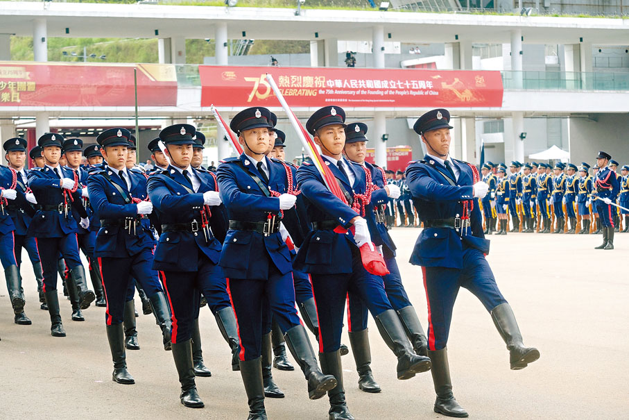 紀律部隊和青少年團體各方隊的列隊表演,共有140多名青少年精英參與,每一位成員都展現出無比的熱情和毅力。紀律部隊聯合步操表演隊形拼出五星紅旗的圖案,顯示出對國家的支持;同時拼出「75」的圖案,慶祝新中國成立75周年。除了精心訓練的匯操表演外,青少年還展現出傳統舞獅和武術的魅力與力量,他們為觀眾呈現了75周年的特別動作,祝願祖國繁榮昌盛、國強民富。