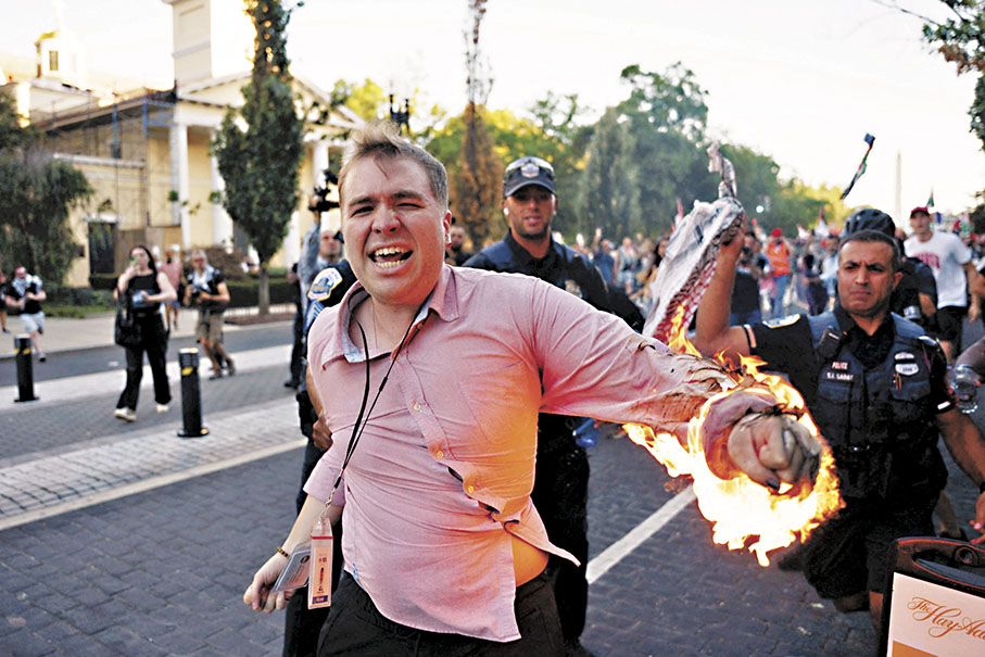 抗議活動持續約兩小時後,一名男性示威者試圖自焚,點燃了自己的左手臂。多名抗議者急忙呼叫警察救援,向自焚男子的手臂上澆水,再用巴勒斯坦傳統樣式的圍巾撲熄火焰。自焚男子痛苦高呼,「我是記者,我們忽視了一些東西、傳播了錯誤的訊息!」警方證實該男子是亞利桑那州居民梅納,他曾在鳳凰城擔任記者,已送院接受治療,沒有生命危險。