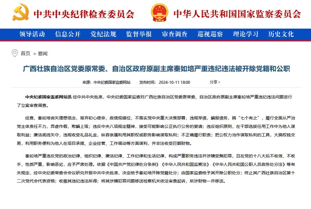 經中共中央批准,中央紀委國家監委對廣西壯族自治區黨委原常委、自治區政府原副主席秦如培嚴重違紀違法問題進行了立案審查調查。