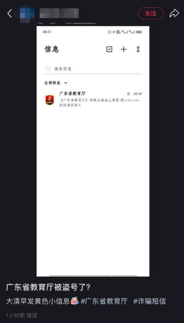據南方都市報報道,今天,不少人收到一條來自「廣東省教育廳」的短訊,寫着「成人電影」。不少網友發帖,質疑該賬號是否被盜號。