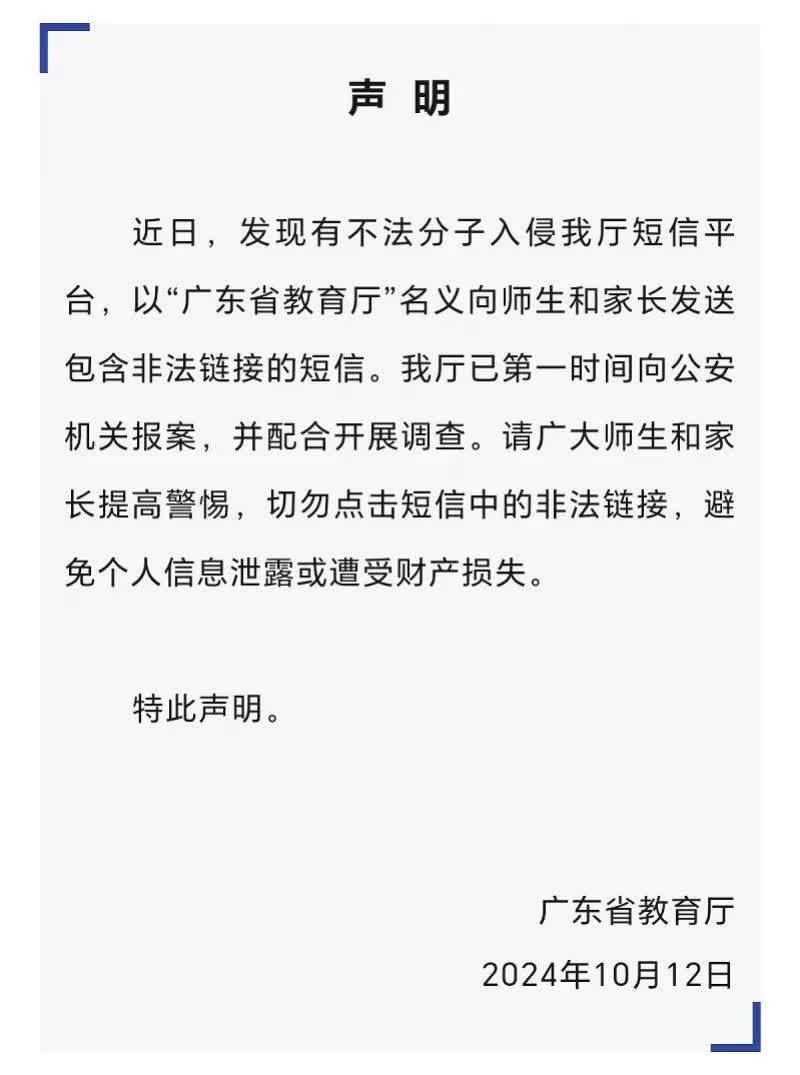 10月12日9時許,廣東省教育廳發布《聲明》。其中提到,近日發現有不法分子入侵廣東省教育廳短訊平台,以「廣東省教育廳」名義向師生和家長發送包含非法鏈接的短訊。省教育廳已第一時間向公安機關報案,並配合開展調查。