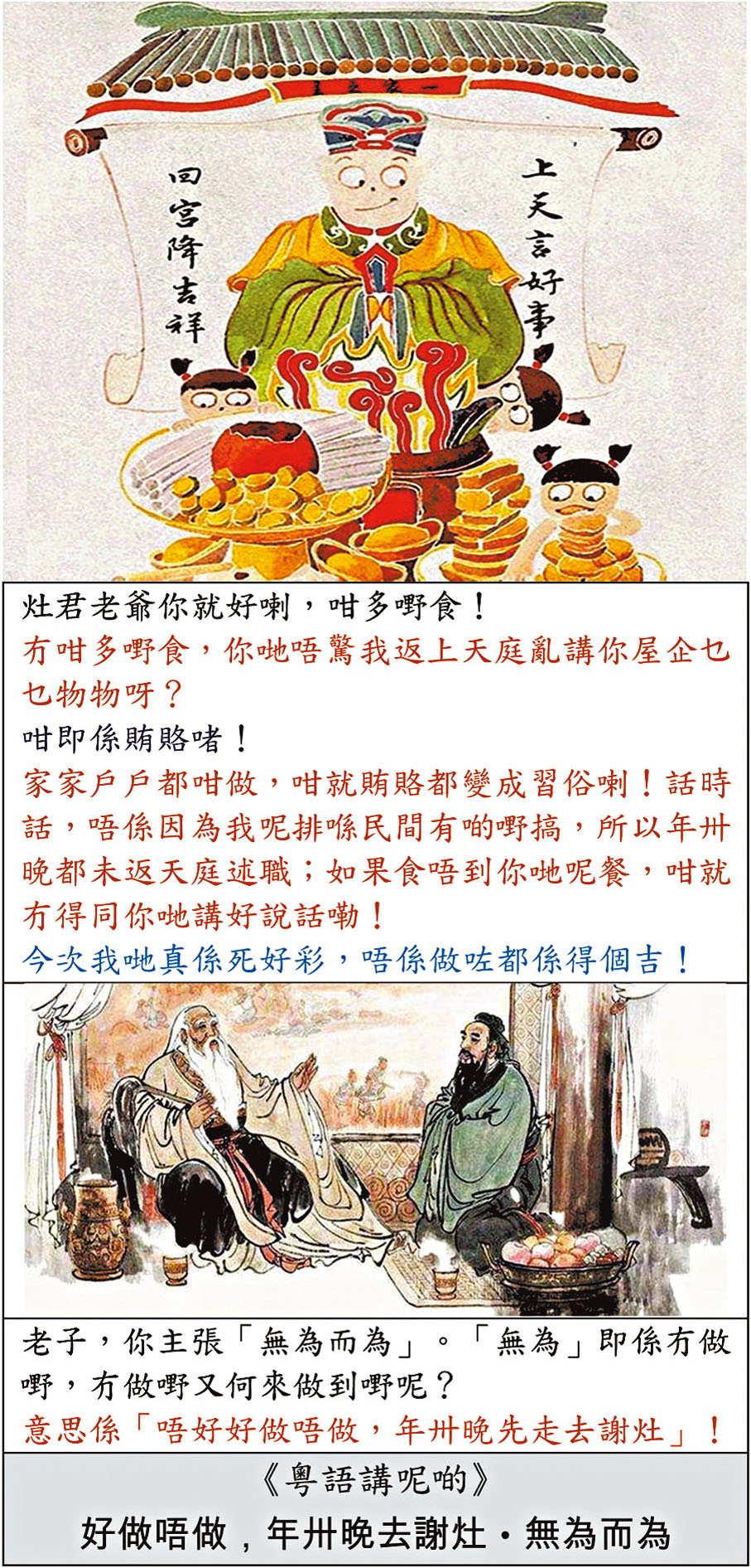 一般人對老子主張的「無為」有所誤解,什麼「無為」即「無所作為」。言下之意,即什麼也「不用為」,快快樂樂的有一天過一天。還有人振振有詞地說,老子因深知一般人能力有限,故建議「不要勉強而為」。以上說法只是望文生義,或斷章取義,不知亂解而已。事實上,老子的思想是「無為而為」,絕非「消極而為」,而是「自然而為」,「該為則為」,「該不為則不為」,「絕不胡作妄為」;這不就是「唔好好做唔做,年卅晚去謝灶」?就此例證可見,廣東話諺語除充滿民間智慧,還會透過顯淺的描述去闡釋一些先哲的大道理哩。今天有人打着為人類謀福祉的旗號,大幹特幹,應是「有為」罷。但看到的是破壞生態環境,造成環境污染、地球暖化等惡行。這種「有為」因「不順應自然而為」,所以不是「真有為」。