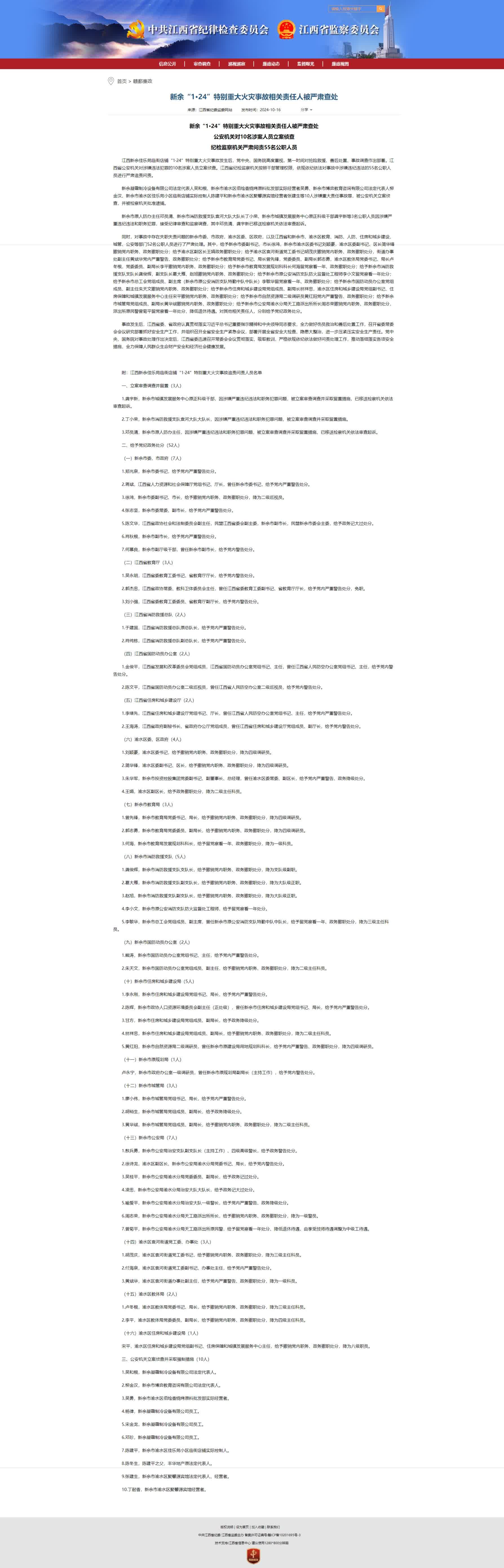 2024年1月24日15時22分,江西省新余市渝水區佳樂苑小區臨街商住綜合樓發生特別重大火災事故。江西省公安機關對涉嫌違法犯罪的10名涉案人員立案偵查。江西省紀檢監察機關按照幹部管理權限,依規依紀依法對事故中涉嫌違紀違法的55名公職人員進行嚴肅追責問責。10月16日,江西省紀委監委公布了新余特別重大火災事故追責問責人員名單。
