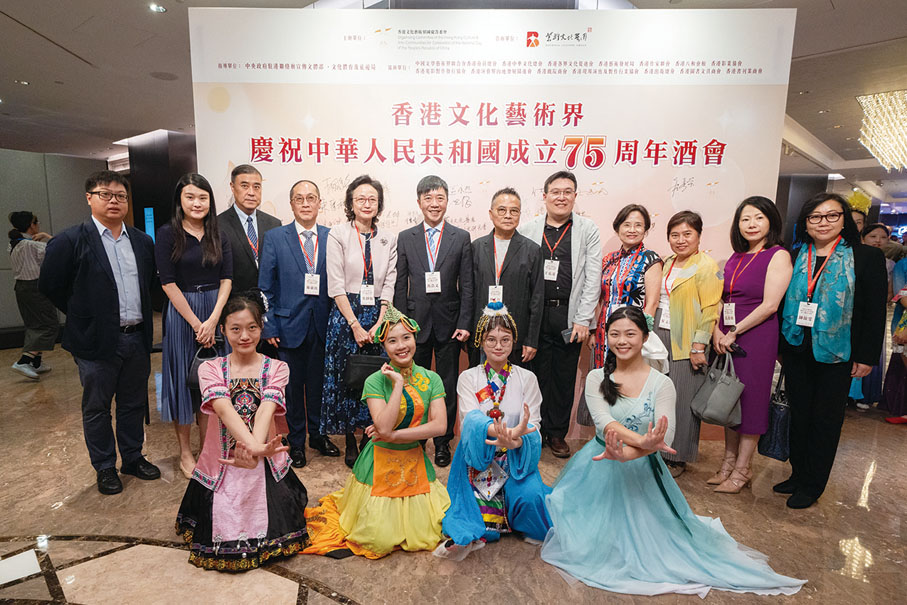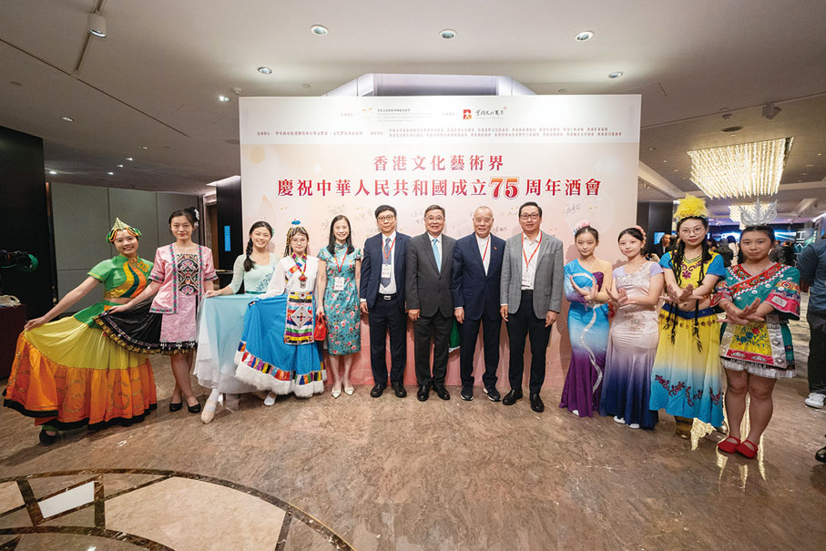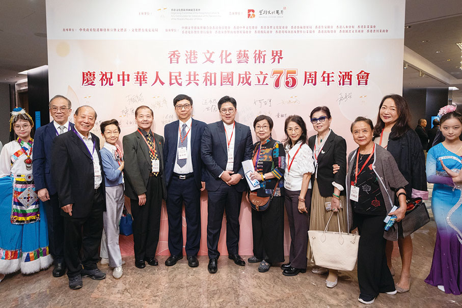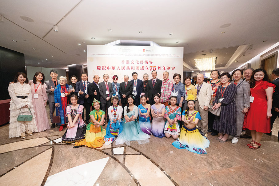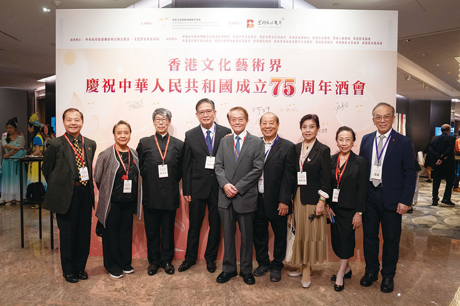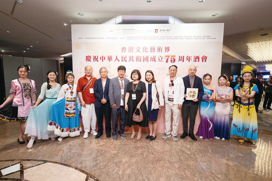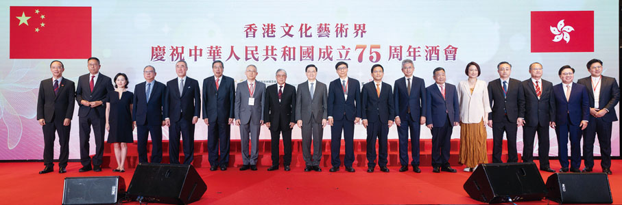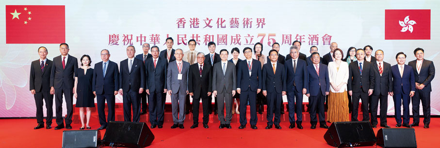 由香港文化藝術界國慶籌備委員會舉辦的香港文化藝術界慶祝中華人民共和國成立75周年酒會日前(7日)在香港 JW萬豪酒店圓滿舉行。行政長官李家超,中央政府駐港聯絡辦秘書長王松苗,外交部駐港特派員公署副特派員李永勝,立法會主席梁君彥,文化體育及旅遊局署理局長劉震,紫荊文化集團董事長許正中,中央政府駐港聯絡辦宣傳文體部副部長李曙光,全國人大常委、立法會議員李慧琼,全國政協常委、西九文化區管理局董事局主席唐英年,香港文聯會長、立法會議員馬逢國,香港藝術發展局主席、籌委會秘書長霍啟剛等應邀出席,在籌委會榮譽贊助人、大會發起人、聯席主席霍震霆及區永熙陪同下共同主禮,與現場一眾本地文藝界精英翹楚及各界友好歡聚一堂,為祖國華誕送上誠摯祝福。