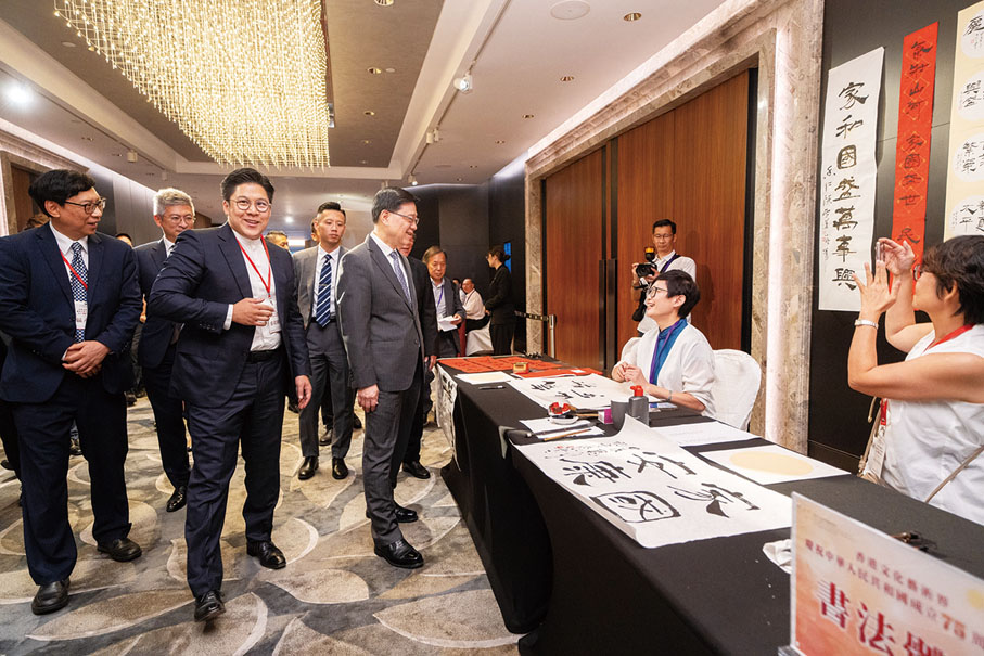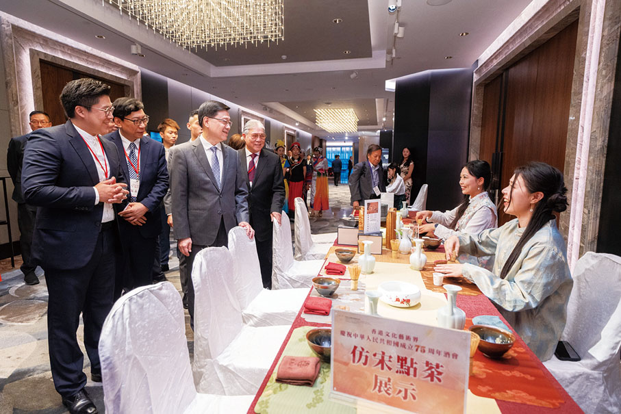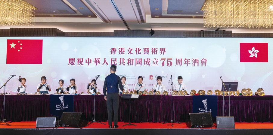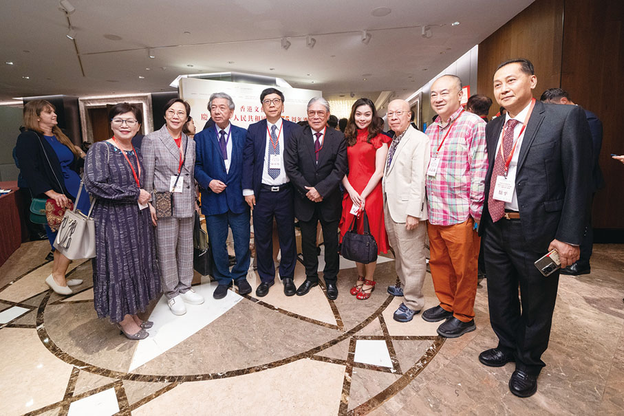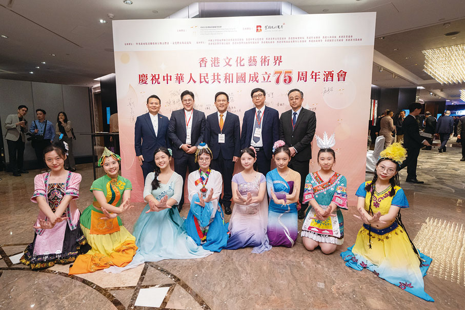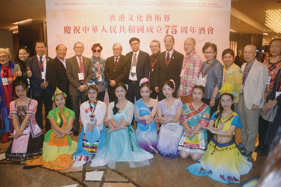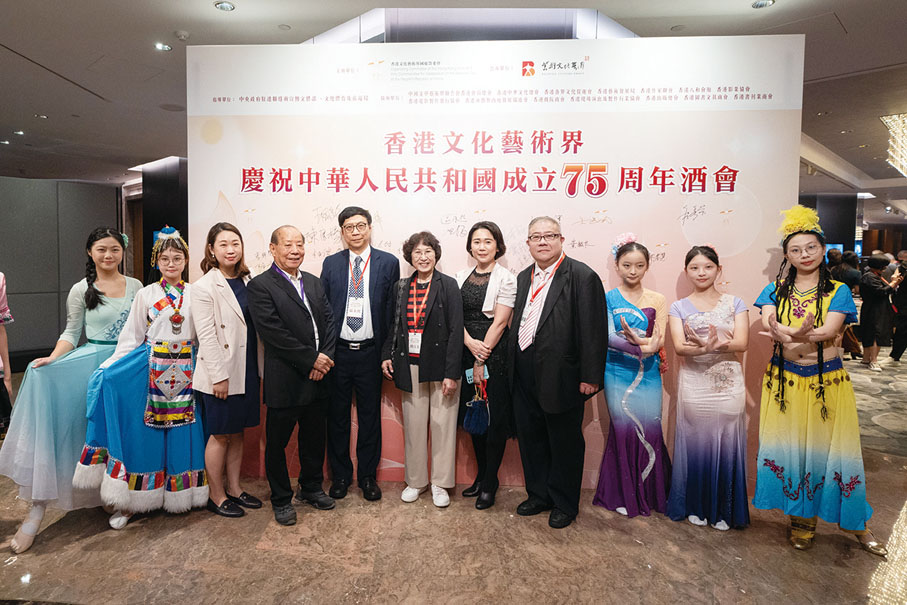 由香港文化藝術界國慶籌備委員會舉辦的香港文化藝術界慶祝中華人民共和國成立75周年酒會日前(7日)在香港 JW萬豪酒店圓滿舉行。行政長官李家超,中央政府駐港聯絡辦秘書長王松苗,外交部駐港特派員公署副特派員李永勝,立法會主席梁君彥,文化體育及旅遊局署理局長劉震,紫荊文化集團董事長許正中,中央政府駐港聯絡辦宣傳文體部副部長李曙光,全國人大常委、立法會議員李慧琼,全國政協常委、西九文化區管理局董事局主席唐英年,香港文聯會長、立法會議員馬逢國,香港藝術發展局主席、籌委會秘書長霍啟剛等應邀出席,在籌委會榮譽贊助人、大會發起人、聯席主席霍震霆及區永熙陪同下共同主禮,與現場一眾本地文藝界精英翹楚及各界友好歡聚一堂,為祖國華誕送上誠摯祝福。
