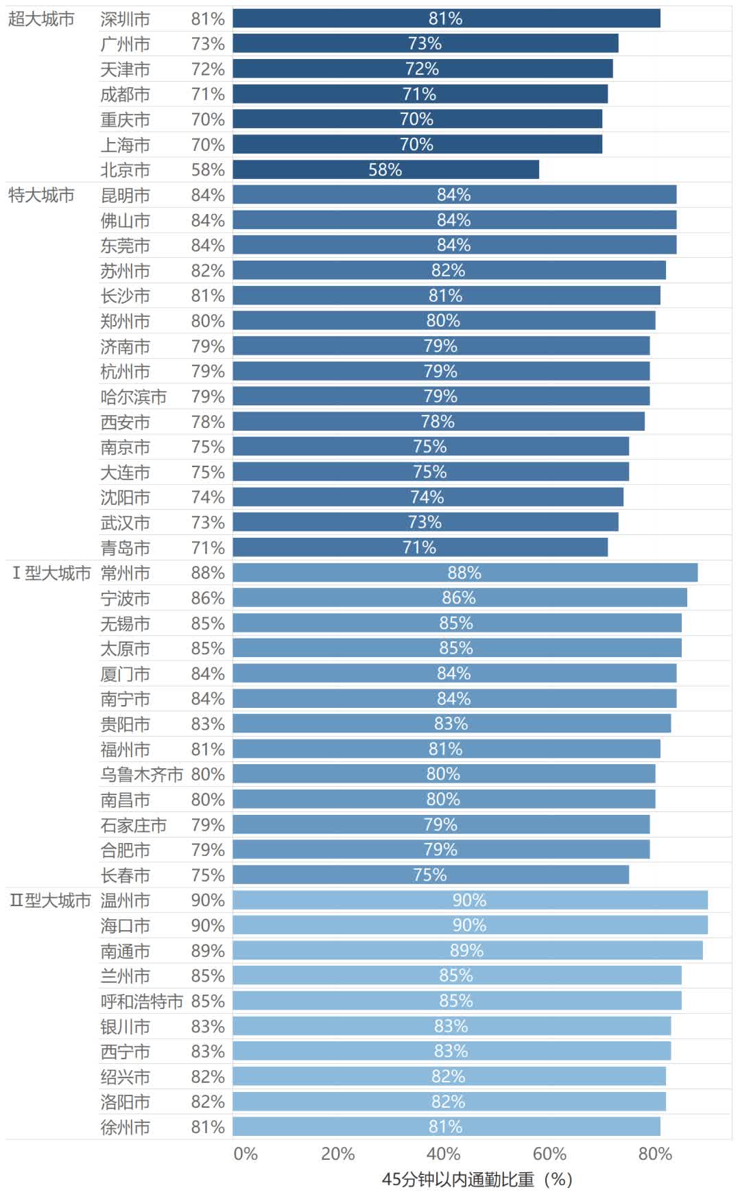 報告指出,2023年,全國層面結束了連續3年幸福通勤全線下降的局面。在45個軌道城市中,有52%的人口實現45分鐘內通勤。一線城市中,深圳45分鐘以內通勤比重81%,同比增加4個百分點,成為首個達到80%目標的超大城市,京廣兩地保持三年同比改善態勢。除北京外,滬穗深均有7成人口單程通勤時間在45分鐘內。