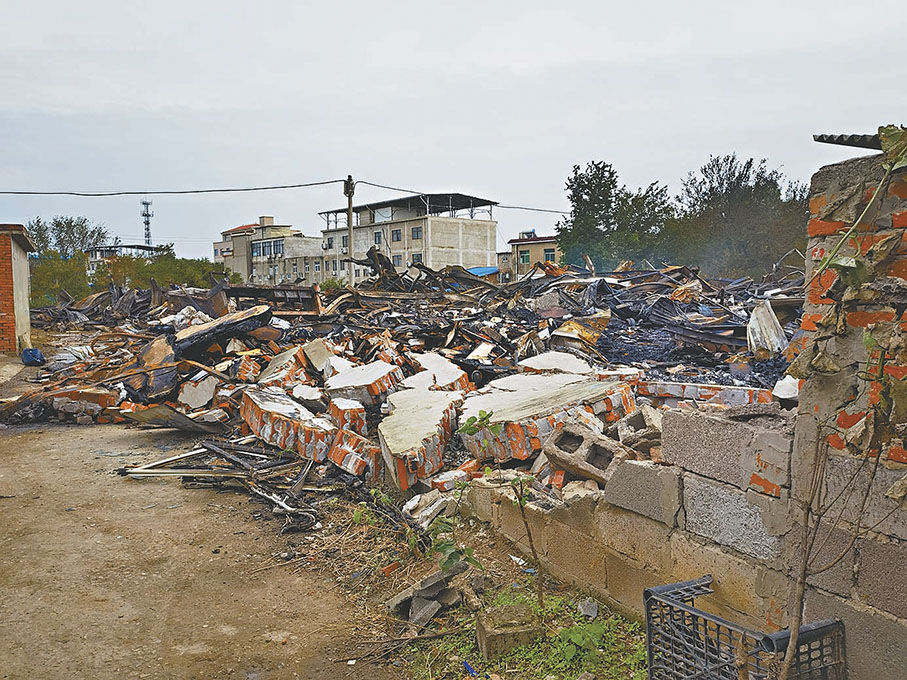 發生火災的是一幢四層民宅,上面兩層已被全部燒毀,部分樓體坍塌。屋前屋後各停放着一台挖掘機,燒焦的木樑和破碎的磚瓦散落一地,原本的牆壁和天花板已經坍塌,露出了房屋的骨架。