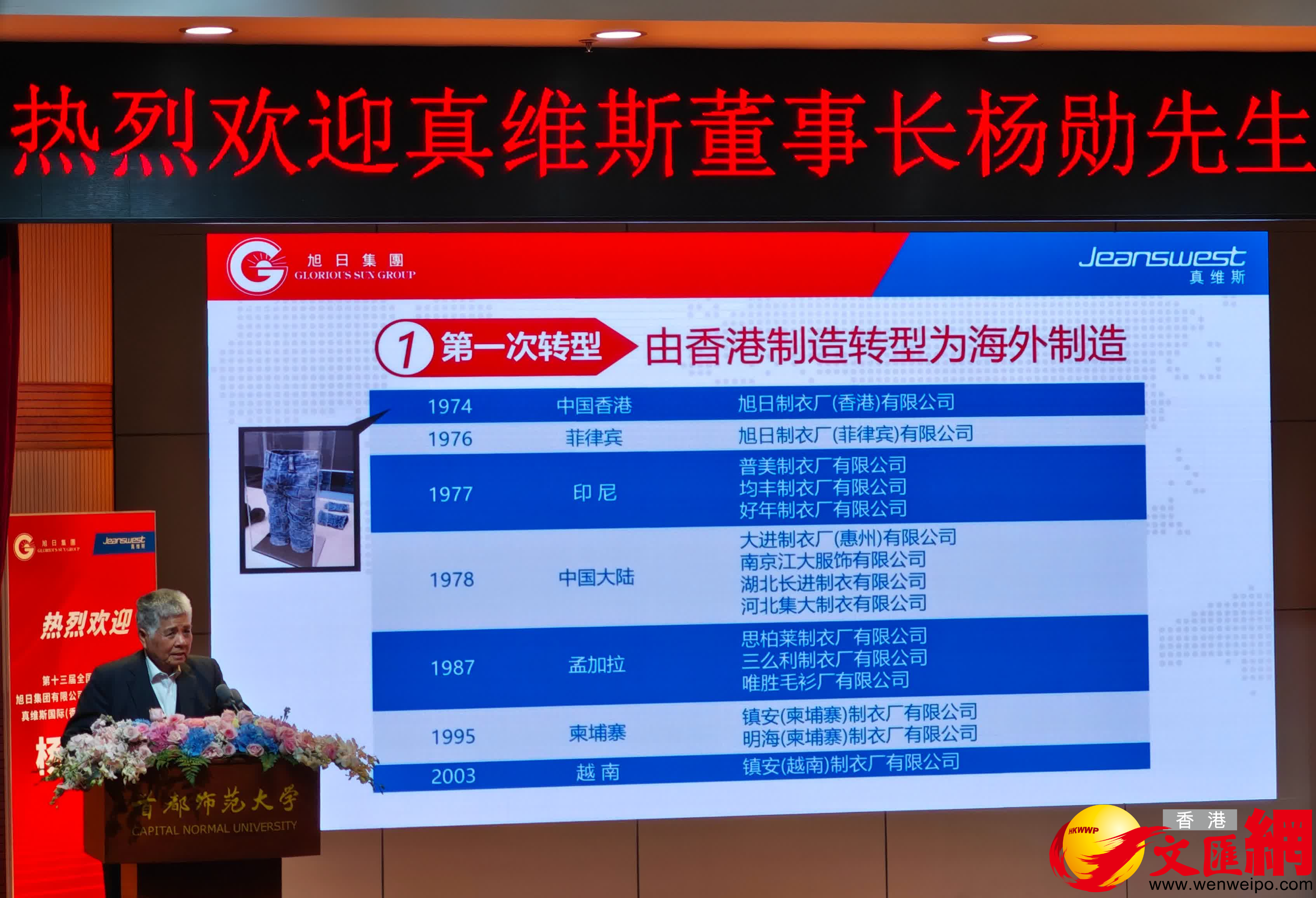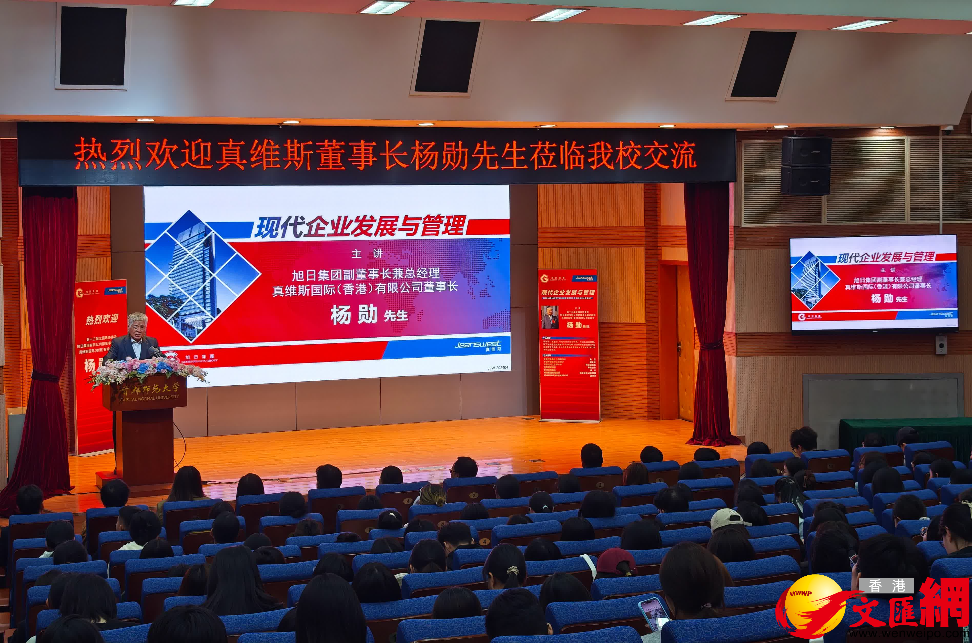 (香港文匯網記者 江鑫嫻)旭日集團有限公司副董事長兼總經理、真維斯國際(香港)有限公司董事長楊勳,19日為首都師範大學的師生們帶來一場主題為《現代企業發展與管理》的精彩講座。他以旭日集團發展為例,從企業主要業務、組織架構、發展歷史、成功因素等方面向師生介紹了企業從「創業」到「守業」的軌跡。此外,楊勳還提到,真維斯通過一系列的創新探索與改革轉型,服裝業務營收增速明顯,今年1-9月對比去年同期增長超60%,業績增長的背後,是「人優我轉」發展宗旨的引領。