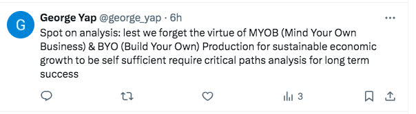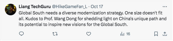 網友@George Yap評論:「真是一針見血!別忘了『做好自己的事』(Mind Your Own Business)和『靠自己』(Build Your Own)的好處。」網友 @Liang TechGuru留言:「『全球南方』需要多樣化的現代化戰略,不能一刀切。感謝王棟教授為我們揭示了中國的獨特道路及其為『全球南方』國家帶來新願景的潛力。」