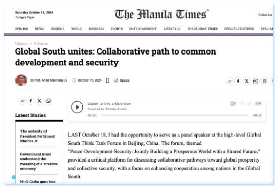 此外,還有多位嘉賓在本國媒體撰文分享論壇成果。菲律賓亞洲世紀戰略研究會副會長安娜·馬林多格·烏伊在菲律賓《馬尼拉時報》撰文稱,論壇為討論實現全球繁榮和集體安全的合作途徑提供了重要平台。巴西247新聞網、《剛果日報》、委內瑞拉SIGUARAYA廣播電視台記者撰文報道,此次論壇彰顯了與會國家攜手應對當前全球挑戰的堅定決心。索馬里國家新聞通訊社、亞美尼亞NEWS.AM通訊社及尼泊爾KTMVOICE網站記者撰文探討論壇達成的重要共識,「全球南方」國家通過科技創新、技術合作、人員交流等方式促進經濟增長,為解決全球性問題提供新的思路和方法。