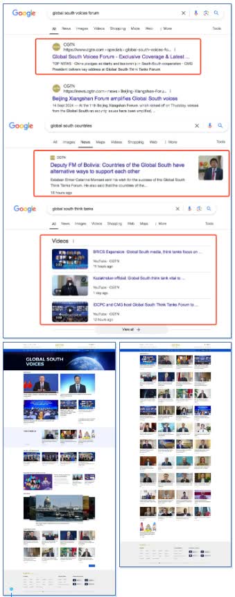 論壇期間,總台CGTN官網及客戶端同步推出《來自「全球南方」的聲音》專題頁面,緊跟論壇動態及亮點,展現「全球南方」攜手共進、共謀發展強音。在谷歌搜索「Global South Voices Forum」「Global South Think Tanks」「Global South Countries」等關鍵詞,CGTN論壇報道均為新聞頁第一位。