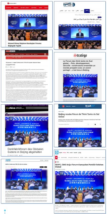總台特稿,廣泛轉載。論壇結束後,總台CGTN官網發布特稿《德必有鄰 全球南方攜手同行》《全球南方國家智庫論壇在京舉行 着眼包容、公平、繁榮的世界》,發出南方國家的團結之音,被來自美國、英國、加拿大、法國、德國、日本、韓國等20個國家和地區的818家海外主流網絡媒體轉載。多語種報道《全球南方國家智庫交流活動在京舉行》《專家稱全球南方國家合作潛力巨大》被聖彼得堡Radio Metro、法國21世紀戰略家網站、《歐洲時報》德文網、巴西247新聞網、印度亞洲新聞社、巴基斯坦IPS MEDIA、土耳其評論新聞網、馬來西亞國家新聞社等397家外媒轉載使用。