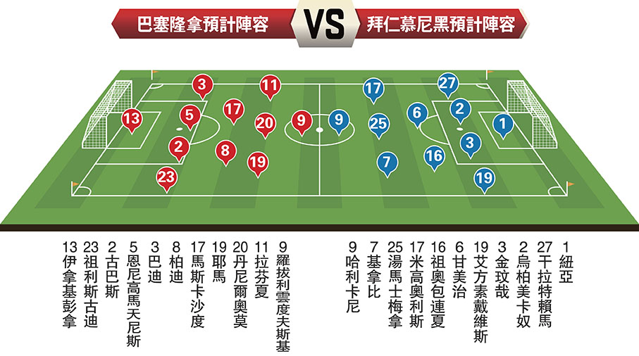 巴塞隆拿與拜仁慕尼黑兩支今季回勇的足球班霸,將於明日凌晨歐洲聯賽冠軍盃(歐聯)強勢交鋒,合演聯賽階段其中一場矚目大戰,亦是主帥費歷克和波蘭神鋒羅拔利雲度夫斯基(利雲)的倒戈戰。費歷克執教拜仁時曾以8:2血洗巴塞,是役帶領「紅黑兵團」主場迎撼舊東家,勢將爆發一場對攻好戲。(Now643台周四凌晨3:00a.m.直播)。 ●香港文匯報記者 梁志達