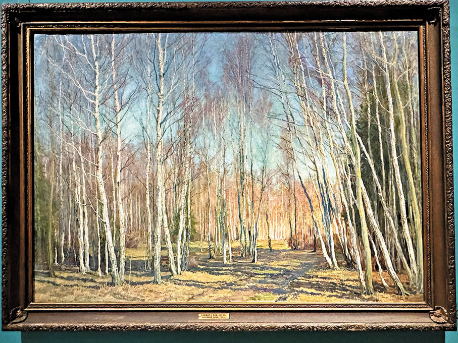 甫入展廳,一片筆挺秀麗的白樺林矗立在展廳中央,營造出獨特的視覺藝術空間。俄羅斯橫跨歐亞大陸,幅員遼闊,長期以來,東西方文明在此交匯、碰撞、融合,形成了獨特的俄羅斯歷史和文化傳統。俄羅斯繪畫是了解俄羅斯人思想情感、精神面貌、生活狀態以及歷史文化的重要藝術形式,在世界藝術史上佔有重要地位。