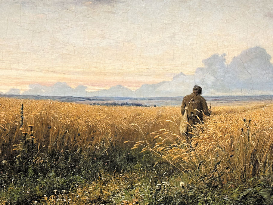 白樺樹是俄羅斯的國樹,也是俄羅斯民族精神的象徵。俄羅斯和蘇聯時期的傑出畫家瓦西里·巴克舍耶夫就在《春日》裏將白樺樹畫出了纖細而又抒情的意味。這幅畫中,畫家將春日的萬物復甦與莫斯科的萬象更新聯繫起來,也體現了畫家本人對大自然色彩的敏銳感知。俄羅斯也是世界上種植黑麥最多的國家,格里高里·米亞索耶多夫在1881年創作的布面油畫《黑麥田裏的路》中,描繪了秋天裏的黑麥田,成熟的黑麥被鍍上了金色,一位穿着破舊衣服的行者沿着麥田中的小路慢慢走向遠處的村莊,畫面簡潔而富有表現力,給人一種平靜與安寧感。