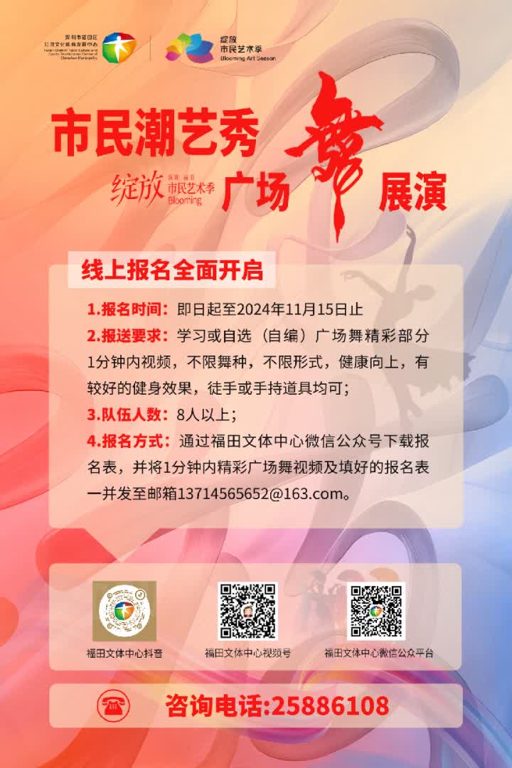 (香港文匯網記者 李薇)在深港人注意啦!如果你對廣場舞藝術充滿熱情,那麼「綻放」2024大灣區廣場舞藝術季將是你的不二舞台!12月份,活動將迎來線下集中展演,現在報名已經火熱開啟。喜歡跳舞、喜歡健身的你們,千萬別錯過這個展示自我、表達創意的舞台。