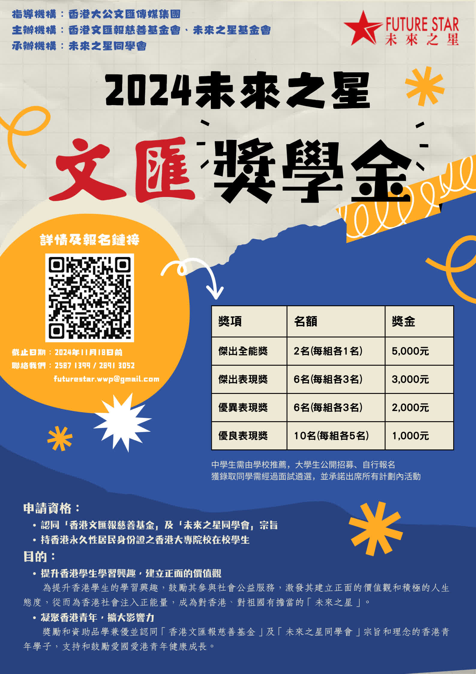 申請人須符合以下兩項準則才符合資格申請「2024未來之星•文匯獎學金」的資助:
