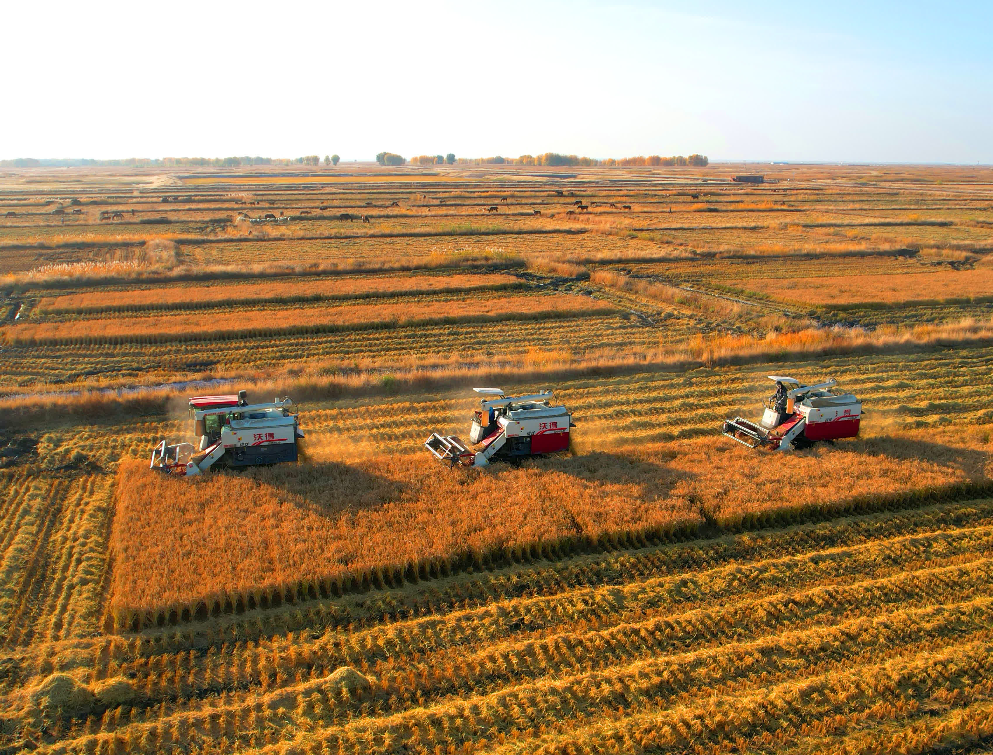 在鎮賚縣建平鄉麗華家庭農場的水田種植基地,三台聯合收割機穿梭其間,收割、脫粒、粉碎稻稈等工序一氣呵成。農場負責人張利介紹,得益於鎮賚縣政府扶持政策和吉林省農科院技術指導,農場通過引進耐鹽鹼水稻品種、優化種植模式等措施,使水稻產量與品質逐年提升。今年農場種植水稻167公頃,產量約240萬斤,同比增長15%。