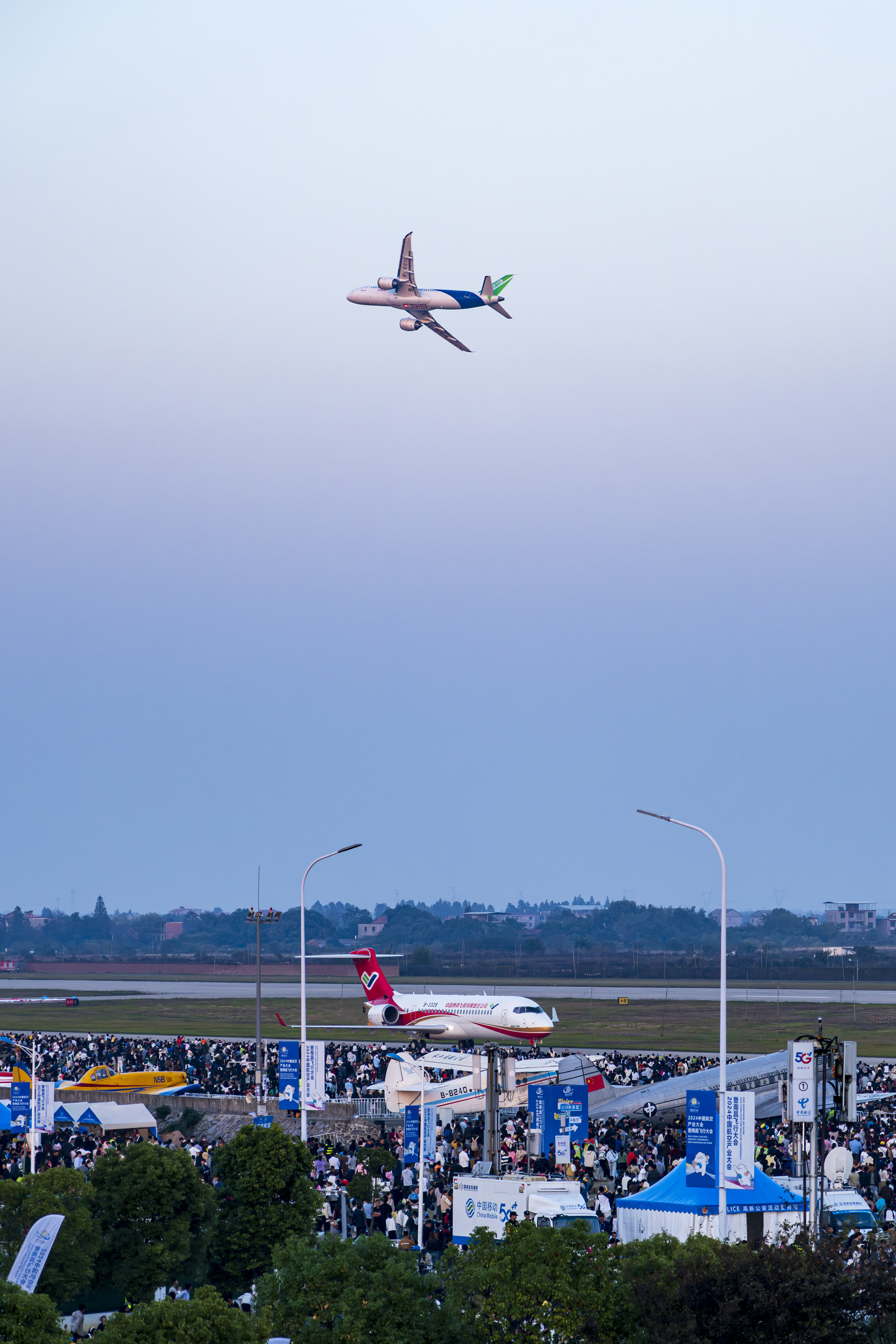據中國商飛介紹,雙機編隊飛行表演後,ARJ21飛機先行着陸,C919飛機則繼續進行低空通場、大俯仰角爬升等單機飛行表演。