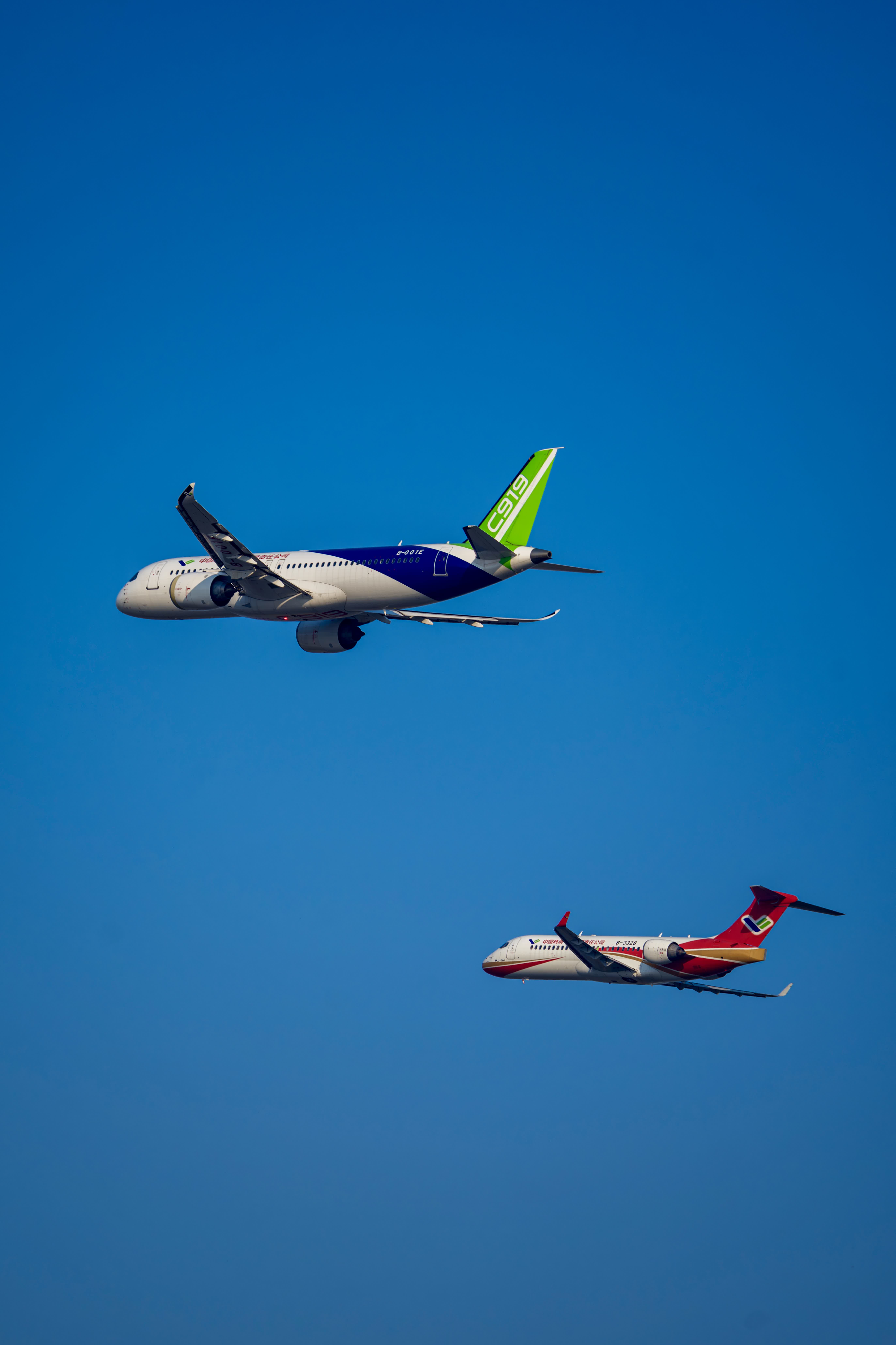(香港文匯網記者 夏微 上海報道)2日,記者從中國商飛獲悉,在2024中國航空產業大會暨南昌飛行大會開幕式上,中國商飛一架ARJ21和一架C919飛機先後起飛,在藍色的天空下,開展編隊集合、協同齊飛、協同轉彎、低空通場等飛行表演項目。這是ARJ21和C919飛機首次雙機編隊飛行表演,集中展示了兩款飛機的良好飛行性能。