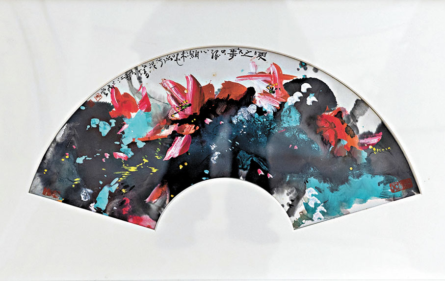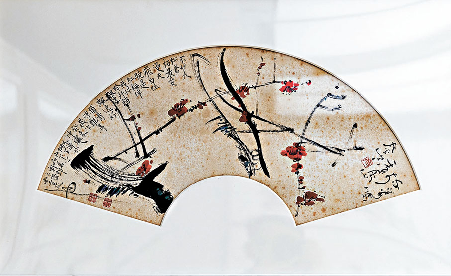 岑文濤畫風多元,除了狂放大氣的書畫作品,展覽現場還有許多別具趣味的小品佳作,譬如在兩幅畫扇作品中,岑文濤用精緻細膩的筆觸,獨具匠心的命意,將傲骨英風的梅花、淤而不染的蓮花,活靈活現地重現於精巧的扇面之上。