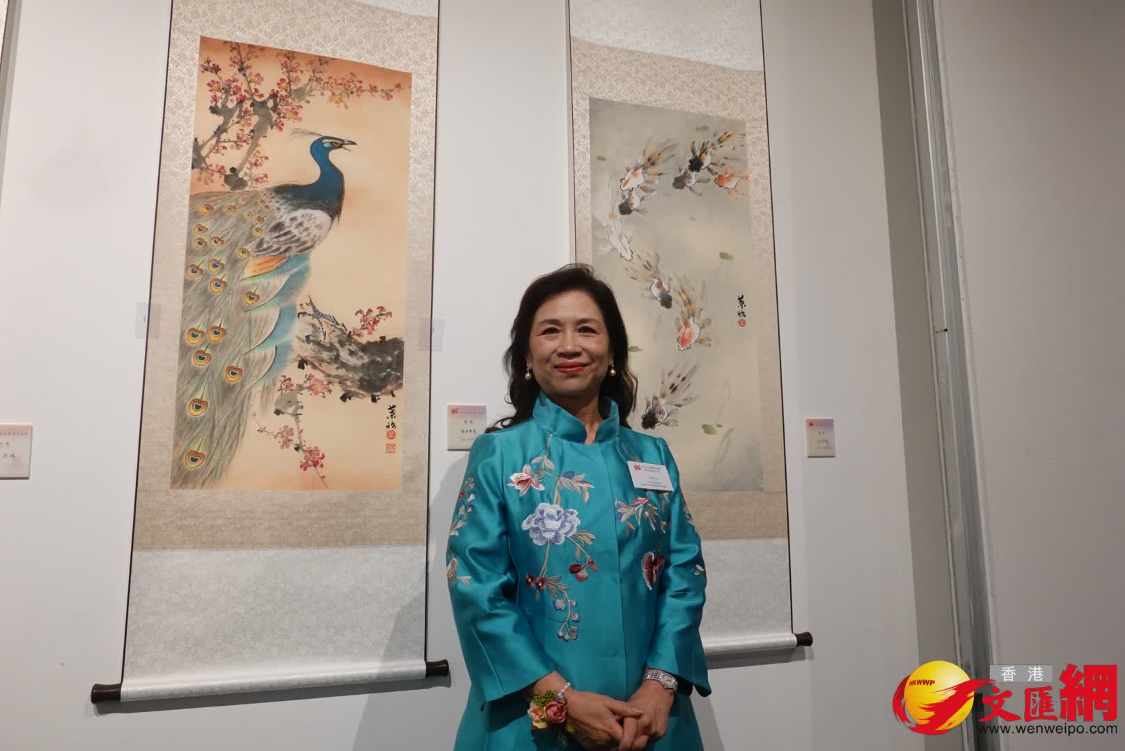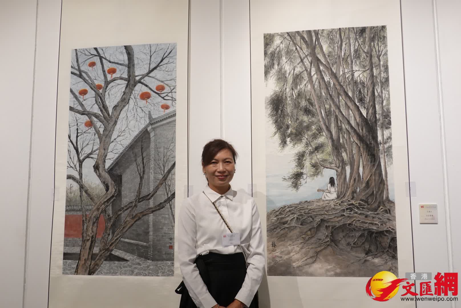 浙江省政協委員、藝術家葉欣獲委任香港女中國書畫家協會永遠名譽顧問,今次她展出兩幅新作,其中一幅「九魚圖」以鮮豔跳躍的色彩描繪了魚群匯聚的吉祥場景。藝術家江詠心帶來在西安寫生的作品《華清燈映》,雖然描繪的是冬天,樹葉落盡,但枝頭有紅色燈籠點點,呈現出喜慶氣息;另一幅則畫的是香港城門水塘,融入畫家自己的背影,充滿情思。