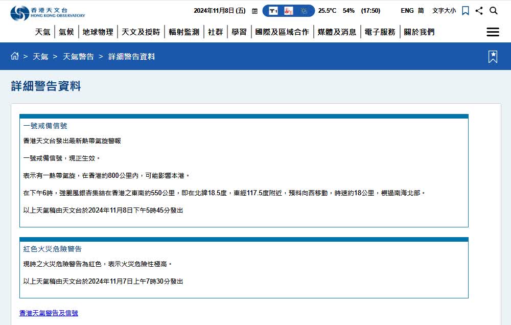 高級科學主任蔡振榮說,由於銀杏的環流較小,與銀杏相關的強風在今日至明早,仍未普遍影響本港,預料一號戒備信號至少維持至明日中午12時。在銀杏及東北季候風的共同影響下,廣東沿岸風力有機會在明日稍後至星期日初時有所增強。天文台會視乎銀杏與珠江口的距離,銀杏的強度,以及本地風力的變化,考慮是否需要改發三號強風信號。