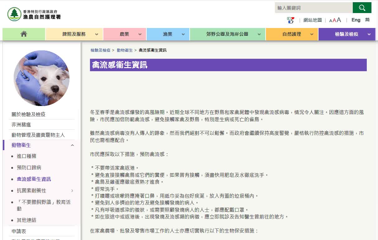 政府各部門會繼續保持高度警覺,嚴格執行防控禽流感的措施。有關預防禽流感的健康提示,可瀏覽漁護署網站。