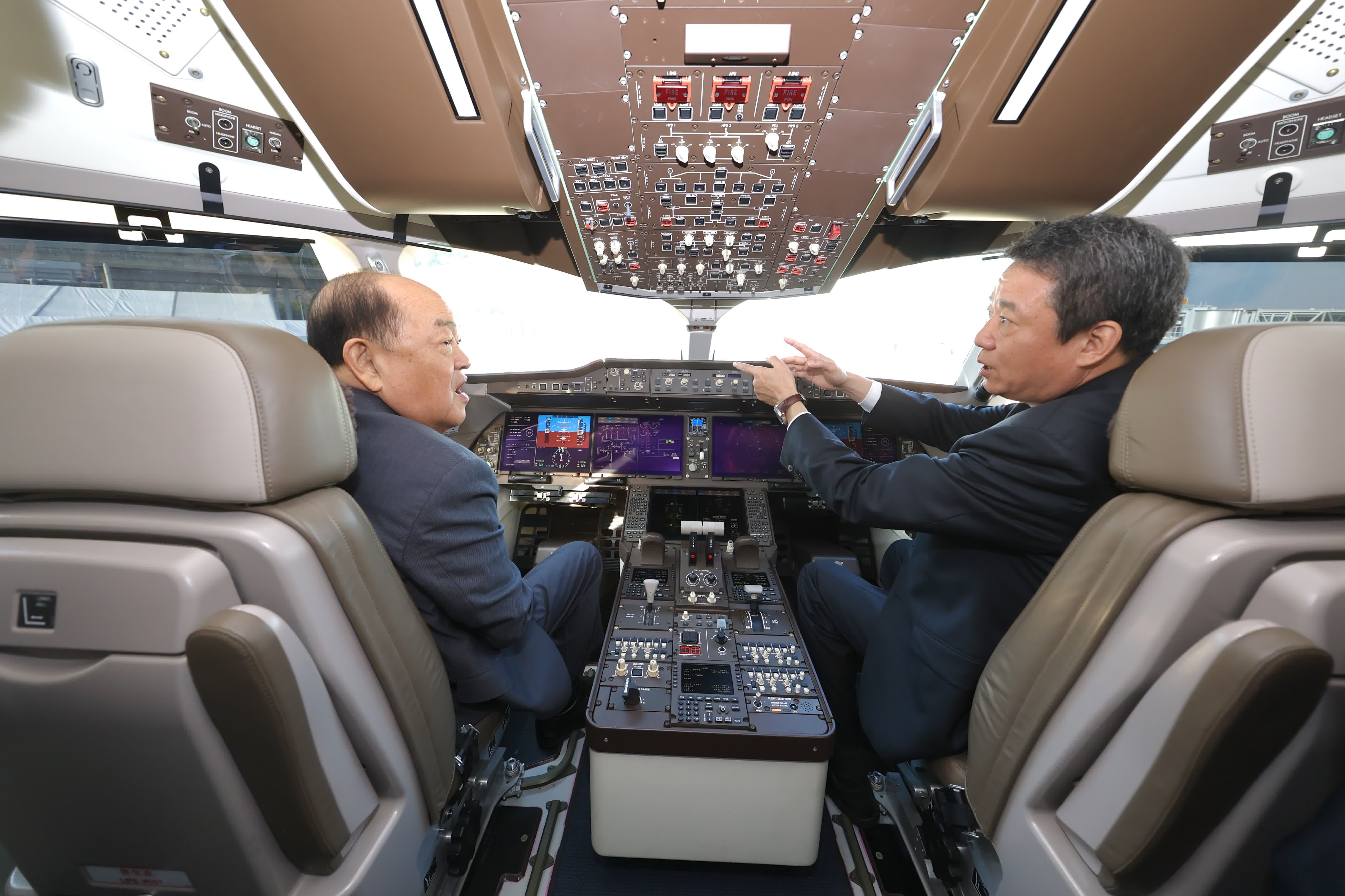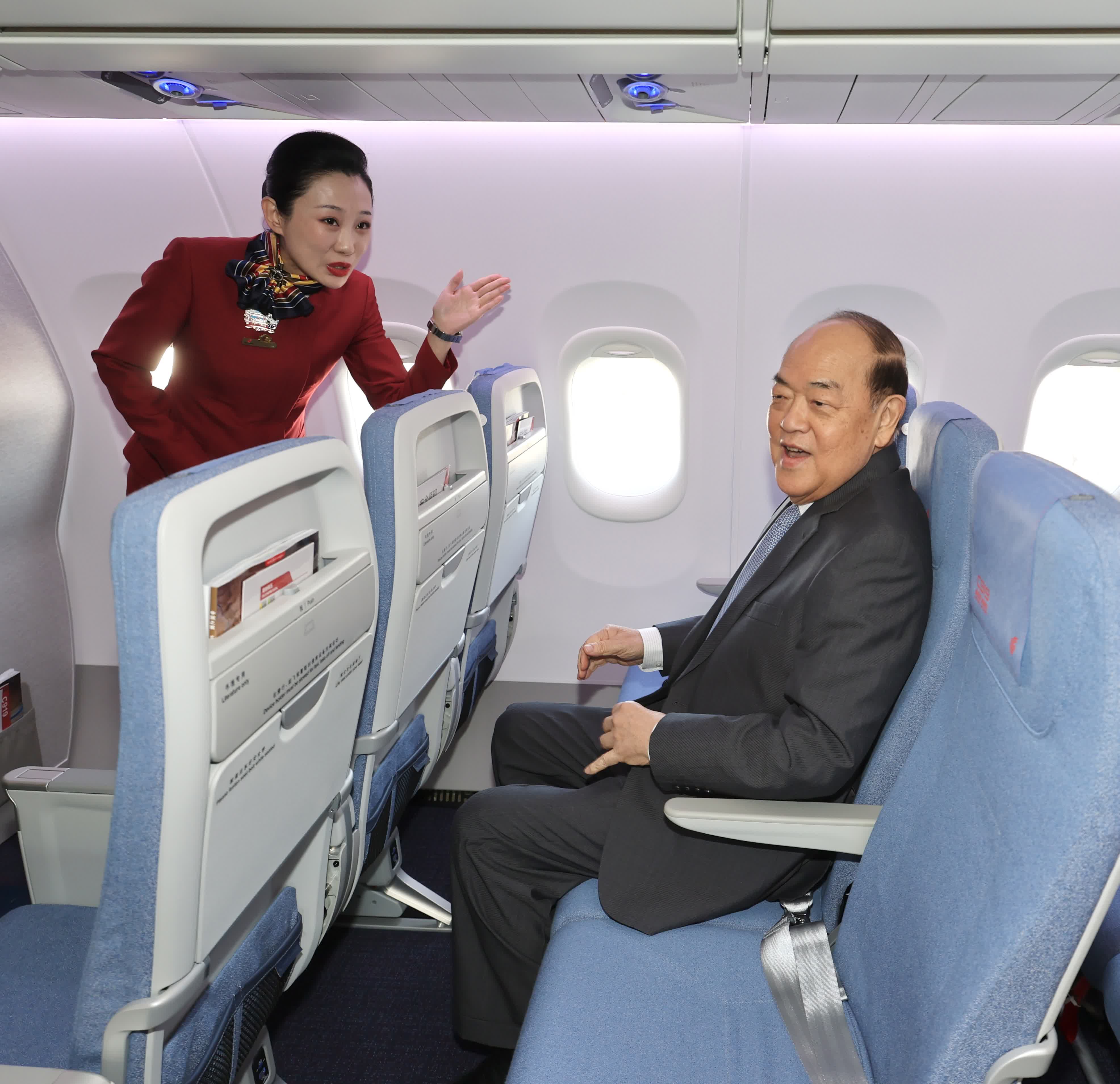 (香港文匯網記者王珏 北京報道)11月8日,身披五星紅旗的國航B-919Y號國產大飛機亮相第十三屆澳門公務航空展,向中華人民共和國成立75周年、澳門回歸祖國25周年獻禮。澳門特別行政區行政長官賀一誠在工務運輸司司長羅立文、澳門民航局局長潘華健、中國航空集團有限公司董事崔曉峰、南光集團總經理姜維亮等陪同下登機參觀,對國產大飛機給予高度讚賞。