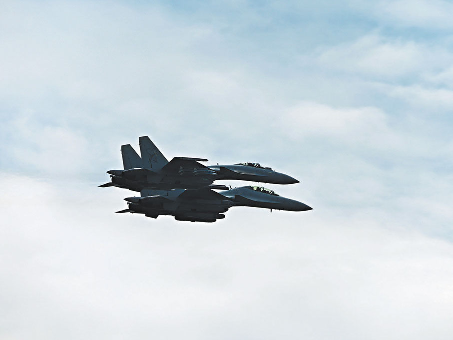 9日,中國海軍殲-15系列艦載機編隊在珠海進行適應性訓練,殲-15T和殲-15D艦載機組成編隊進行適應性訓練。據了解,殲-15T是一型重型艦載機,擁有良好的空戰和打擊能力,是航母編隊的核心武器裝備,是中國海軍航空兵的重要力量。而殲-15D是一型雙座艦載電子戰飛機,也是解放軍第一款艦載專用戰術電子戰飛機。殲-15D首次公開亮相本屆航展,該型號的特點是安裝了大型電子戰吊艙,集電子干擾及打擊等能力於一體,可在未來航母編隊奪取制空權中發揮重要作用。