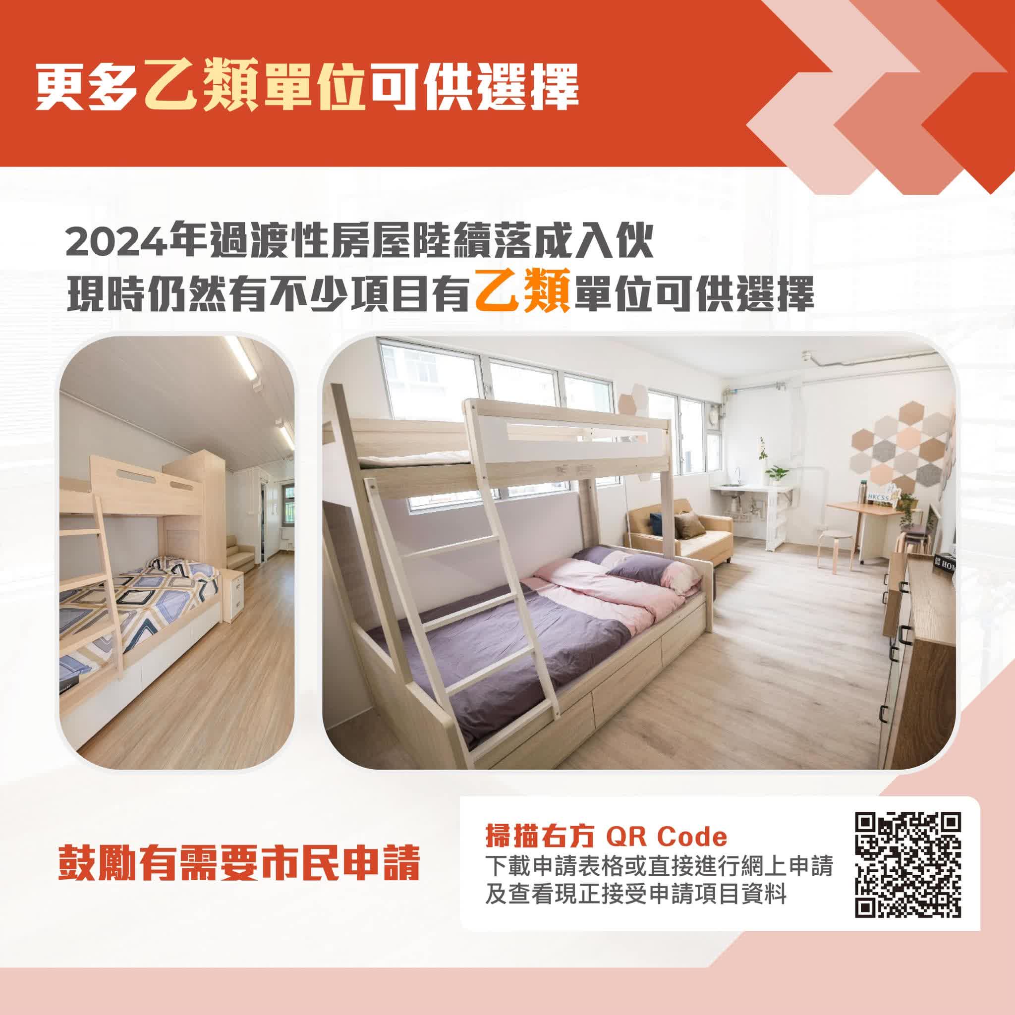 她提到,一眾營運機構都認同有關安排,現時已有12個項目調整了甲乙類比例,9個調整為50:50,另有3個調整為60:40。在現有約17,900個過渡性房屋單位中,可供乙類租用的單位超過6,500個。當中鄰近紅磡港鐵站的「善匯」、大埔的「樂善村」及「善樓」、元朗的「路德會雙魚薈」、「路德會七星薈」及「新田部屋」,及打鼓嶺的「博愛昇平村」,還有一定數量的乙類單位,歡迎有需要的合資格市民申請。