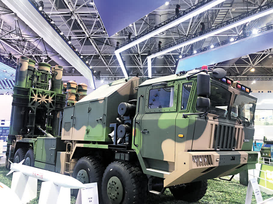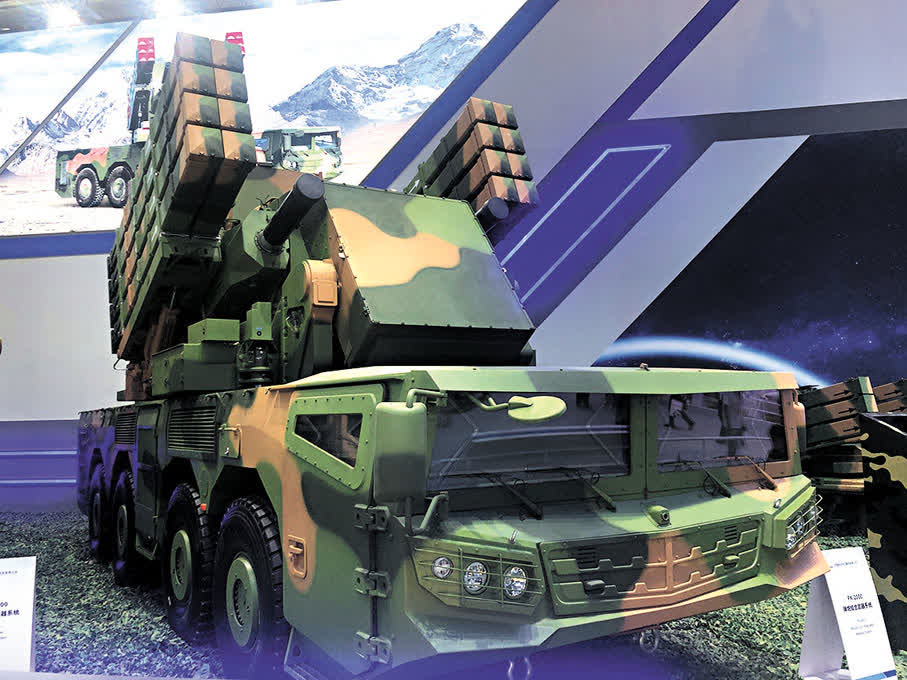 香港文匯報記者10日在中國航天科工集團展區看到,FK-2000系統在8大輪的高機動卡車搭載了2挺6管30毫米機炮以及12枚防空導彈。作為全天候近程末端防空武器系統,FK-2000集成多種殺傷性手段於一體,其最大的亮點與優勢是能在行進中自主搜索發現目標,可在行進狀態中開火,具有發射導彈或炮彈等多重火力,執行伴隨防空任務。業內專家坦言:「12管的30毫米機炮發射的密集彈幕對於任何低空目標都是致命的」。而且,單車可有效摧毀防禦半徑為25公里內的巡航導彈、四旋冀或多旋冀無人機等多類目標,同時兼顧打擊地面目標,因此被業內稱為「戰車」。中國航天科工集團相關負責人表示,FK-2000同時裝備了「有源相控陣雷達+光電多模探測組件」,探測精度和打擊精度有了極大提高。