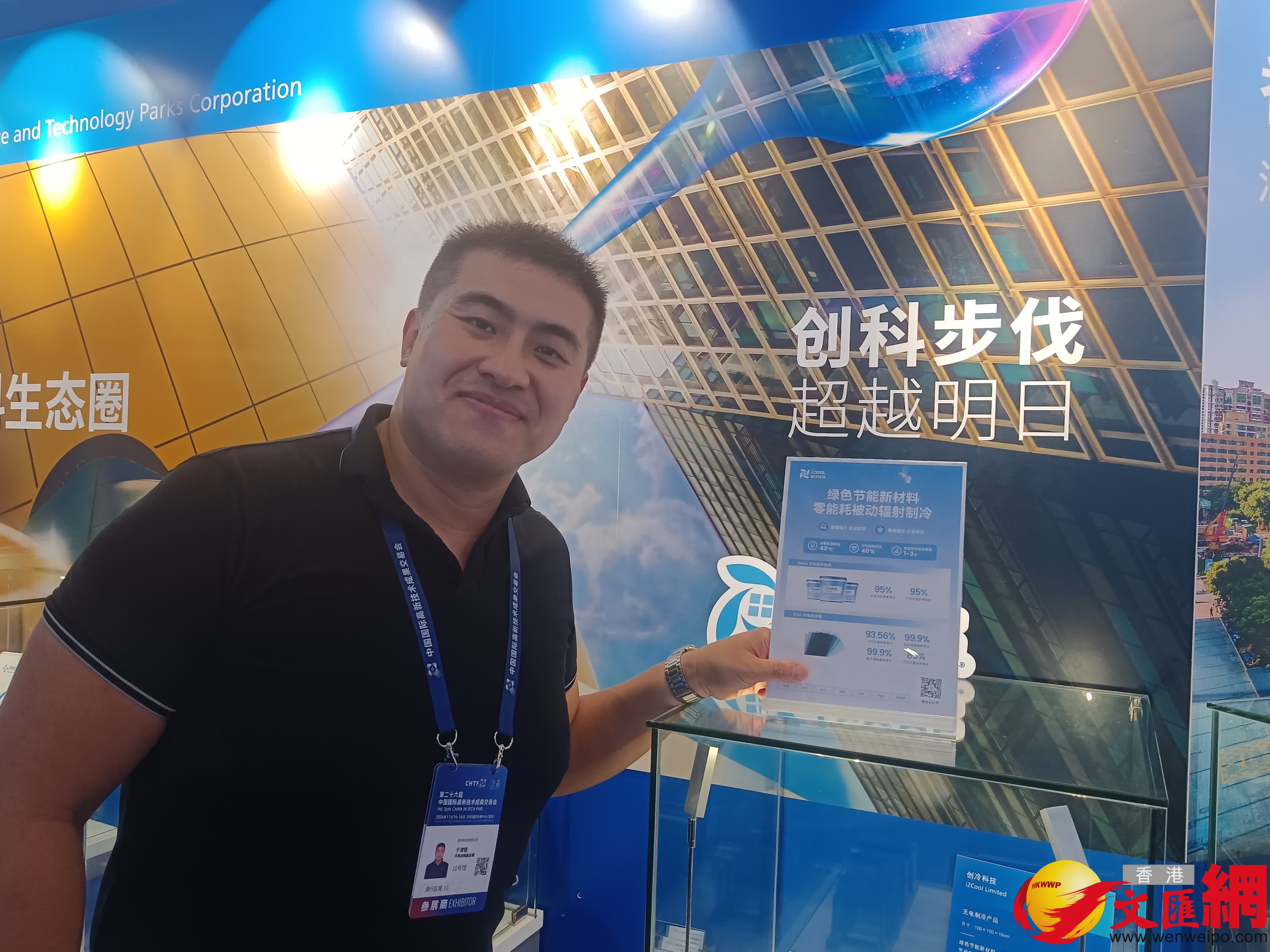 值得一提的是,參展商中的創冷科技備受關注。該公司由香港城市大學能源及環境學院教授及年輕科學家共同創立,專注於無電製冷技術的研發與應用。通過自研的納米材料,創冷科技實現了高效的太陽光反射和中紅外輻射,降溫效果最高可達42℃。這項技術廣泛適用於建築、電力、新能源、物流、儲糧、光伏、化工等多個場景,為助力全球可持續發展及實現碳中和目標提供了有力支持。
