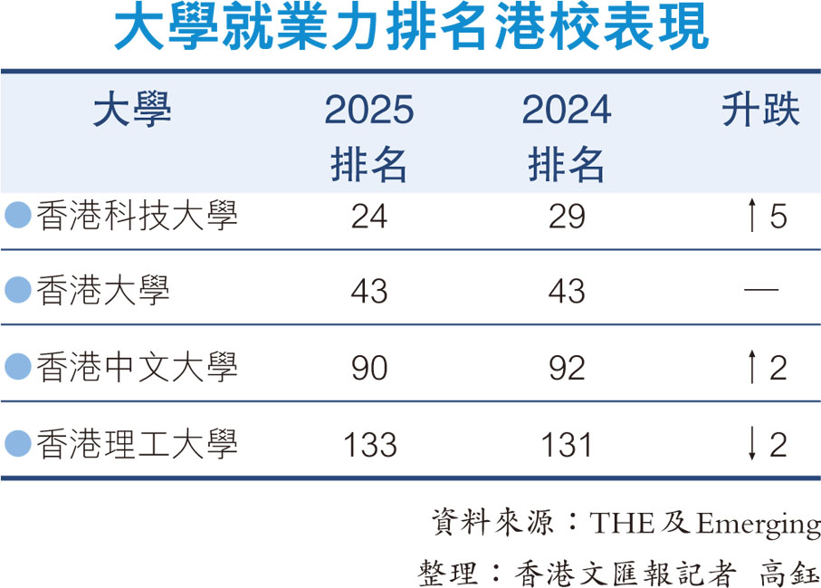 香港文匯報訊(記者 高鈺)泰晤士高等教育(THE)及國際人力資源顧問公司Emerging昨日發布全球大學畢業生就業能力排名2025,香港共有3所大學打入百強,其中以香港科技大學最高,位列第二十四,較去年躍升5位。香港大學與去年一樣排第四十三,香港中文大學上升兩位排第九十名。香港理工大學亦上榜,排第一百三十三位。