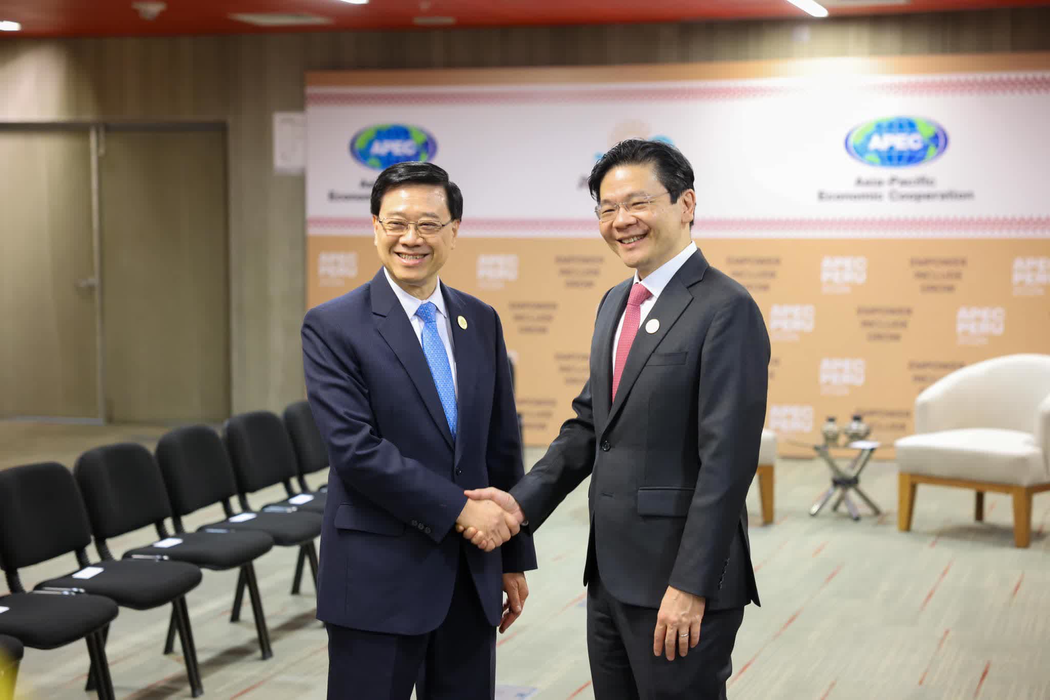 行政長官李家超在秘魯利馬展開訪問行程。李家超今日(16日)在社交平台發文表示,APEC會議期間,很高興與新加坡總理黃循財進行會面。他首先祝賀黃循財於今年5月就任新加坡總理,並感謝新加坡一直表示支持香港申請加入《區域全面經濟夥伴關係協定》(RCEP)。