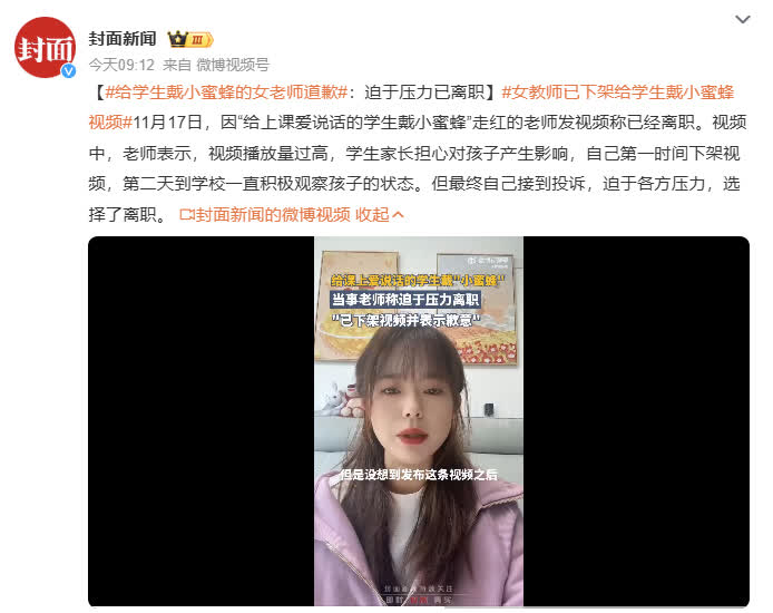 據封面新聞微博消息,11月17日,因「給上課愛說話的學生戴小蜜蜂」走紅的老師發視頻稱已經離職。視頻中,老師表示,視頻播放量過高,學生家長擔心對孩子產生影響,自己第一時間下架視頻,第二天到學校一直積極觀察孩子的狀態。但最終自己接到投訴,迫於各方壓力,選擇了離職。