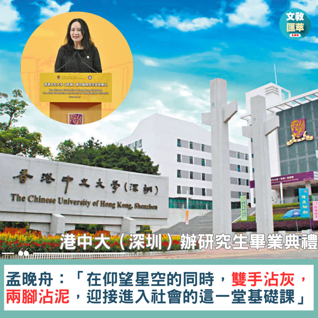 香港文匯報訊(記者 莫楠)香港中文大學(深圳)上周舉行第九屆研究生畢業典禮,共1500多名研究生參加,中大校長段崇智、港中大深圳校長徐揚生亦出席見證。典禮更特別邀請了甚少公開露面的華為副董事長、全球財務長孟晚舟發表演講,她向畢業生分享了知識獲取與專業發展之道,著重闡述了把理論用於實踐的重要性,以及在專業領域精進的必要性,希望同學們能夠「在仰望星空的同時,雙手沾灰,兩腳沾泥,迎接進入社會的這一堂基礎課」。