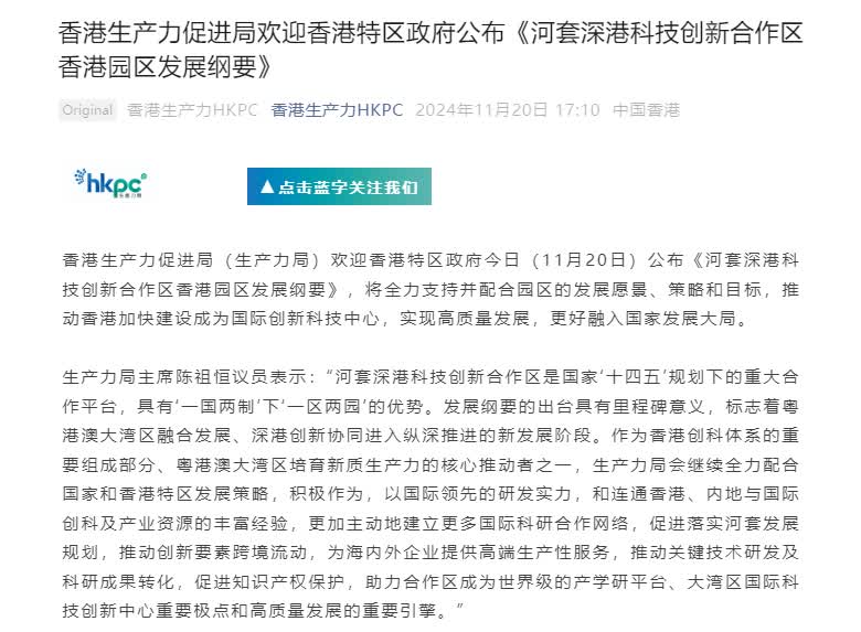 生產力局主席陳祖恒議員表示:「河套深港科技創新合作區是國家『十四五』規劃下的重大合作平台,具有『一國兩制』下『一區兩園』的優勢。發展綱要的出台具有里程碑意義,標誌着粵港澳大灣區融合發展、深港創新協同進入縱深推進的新發展階段。作為香港創科體系的重要組成部分、粵港澳大灣區培育新質生產力的核心推動者之一,生產力局會繼續全力配合國家和香港特區發展策略,積極作為,以國際領先的研發實力,和連通香港、內地與國際創科及產業資源的豐富經驗,更加主動地建立更多國際科研合作網絡,促進落實河套發展規劃,推動創新要素跨境流動,為海內外企業提供高端生產性服務,推動關鍵技術研發及科研成果轉化,促進知識產權保護,助力合作區成為世界級的產學研平台、大灣區國際科技創新中心重要極點和高質量發展的重要引擎。」
