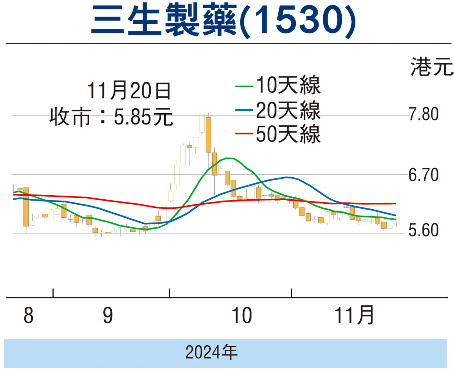 三生製藥昨升1.98%,收報5.85元,成交4,400萬元。過去一個月,該股呈倒「V型」走勢,9月底10月初由5.56元抽升上7.85元高位,其後受大市急跌及美國通過《生物安全法案》影響,股價插落至5.64元始獲承接,41%的升幅幾打回原形。該股昨連續第二天反彈,重上10天線,管理層不斷增持有利業績增長預期,可順勢跟進,上望6.50元,跌穿5.50元止蝕。
