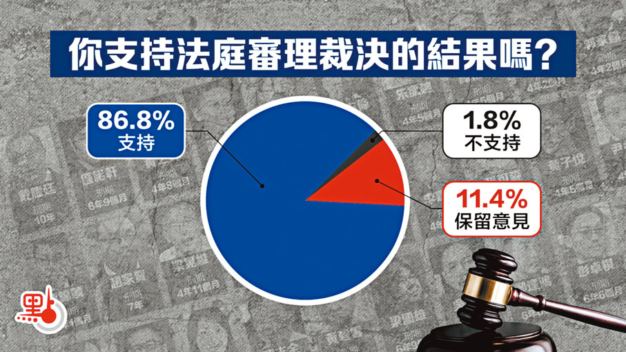 在是否支持法庭審理裁決結果上,86.8%(2,445人)的受訪者表示「支持」,11.4%(323人)的受訪者對此持保留意見。