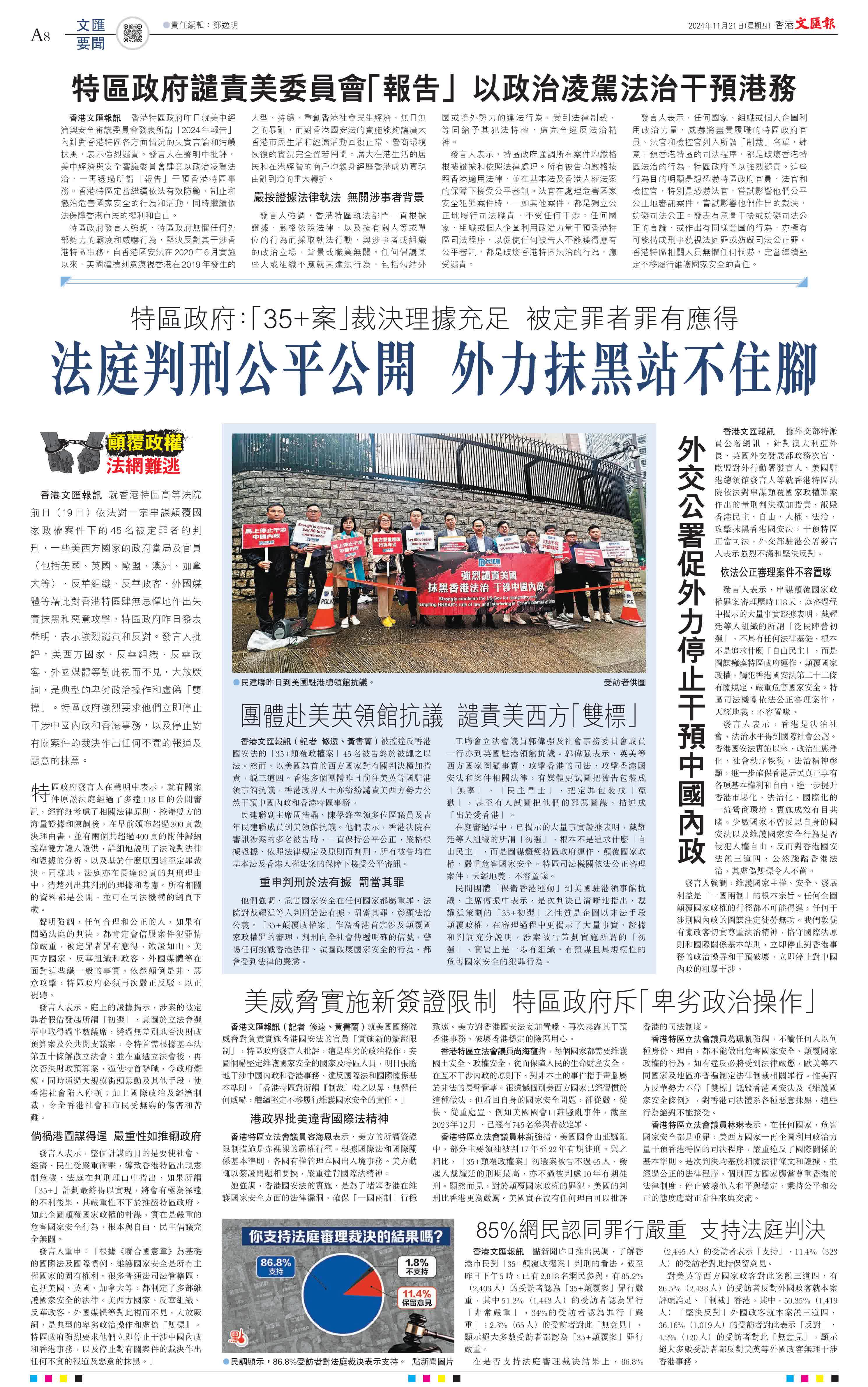 香港文匯報訊 就香港特區高等法院前日(19日)依法對一宗串謀顛覆國家政權案件下的45名被定罪者的判刑,一些美西方國家的政府當局及官員(包括美國、英國、歐盟、澳洲、加拿大等)、反華組織、反華政客、外國媒體等藉此對香港特區肆無忌憚地作出失實抹黑和惡意攻擊,特區政府昨日發表聲明,表示強烈譴責和反對。發言人批評,美西方國家、反華組織、反華政客、外國媒體等對此視而不見,大放厥詞,是典型的卑劣政治操作和虛偽「雙標」。特區政府強烈要求他們立即停止干涉中國內政和香港事務,以及停止對有關案件的裁決作出任何不實的報道及惡意的抹黑。