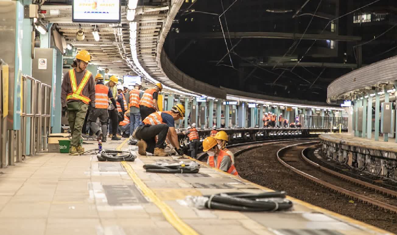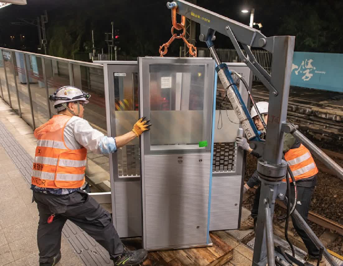 港鐵表示,目前9個車站的自動月台閘門安裝工程已經完成,預計九龍塘站將於今年內完成安裝。最後一批月台弧度較大的車站——羅湖站、旺角東站安裝工程正在進行,大學站安裝工程已經展開,預計全線月台自動月台閘門安裝工程、共1600對閘門將於明年內完成安裝。