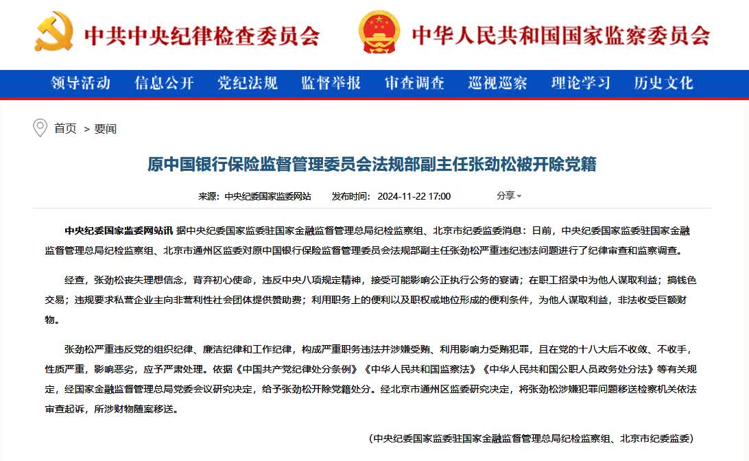 據中央紀委國家監委駐國家金融監督管理總局紀檢監察組、北京市紀委監委消息:日前,中央紀委國家監委駐國家金融監督管理總局紀檢監察組、北京市通州區監委對原中國銀行保險監督管理委員會法規部副主任張勁松嚴重違紀違法問題進行了紀律審查和監察調查。