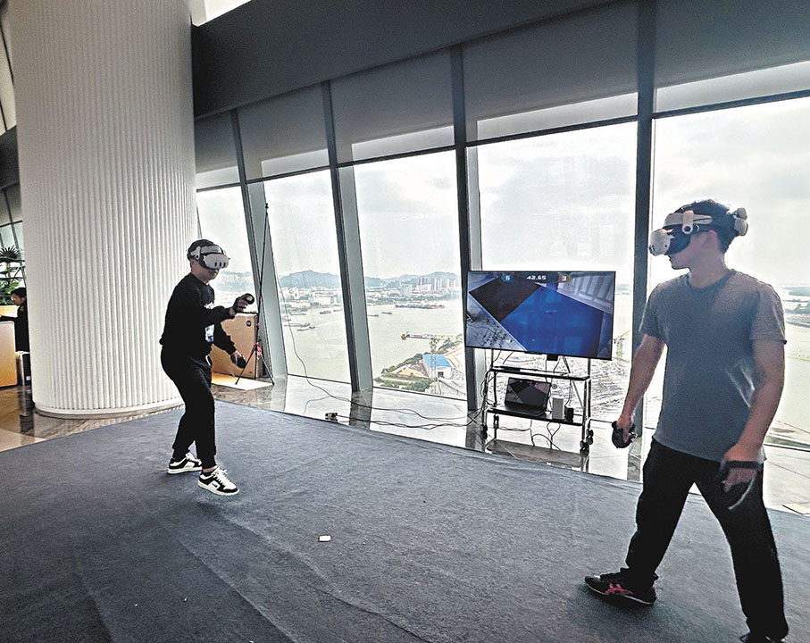 此次展會,倚天(eTeam)公司重點展示其第一個標準化的XR數智體育項目—Blitz極速閃球。香港文匯報記者現場所見,這是一款結合了MR技術、兼具高互動性與易玩性的團隊協作運動項目,在對陣中,玩家通過MR眼鏡和手柄感應裝置,以簡單的手勢動作,可控制虛擬能量球和能量盾在團隊中進行對戰和防守。雖然是虛擬玩法,但玩家的手部、腿部乃至全身都保持運動,競技性和娛樂性俱佳。